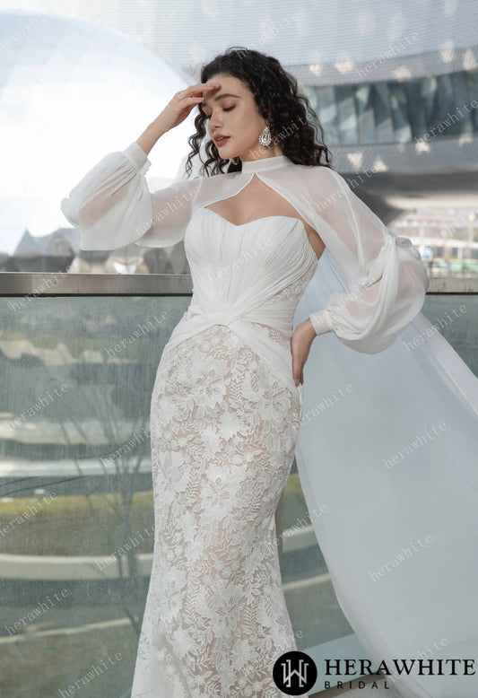 Ruth- Pleated Mermaid Wedding Dress with Sheer Cape