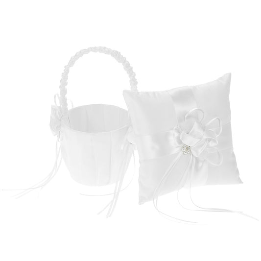 White Satin Bowknot Rhinestone-Pearl Decorated Ring Bearer Pillow and Flower Girl Basket Set