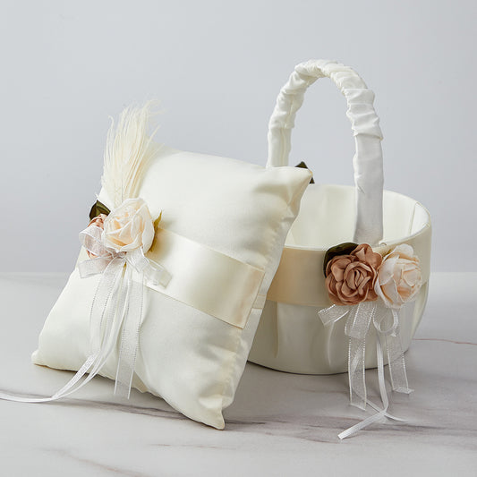 Off White Satin Flower Bowknot Ring Bearer Pillow and Flower Girl Basket Set