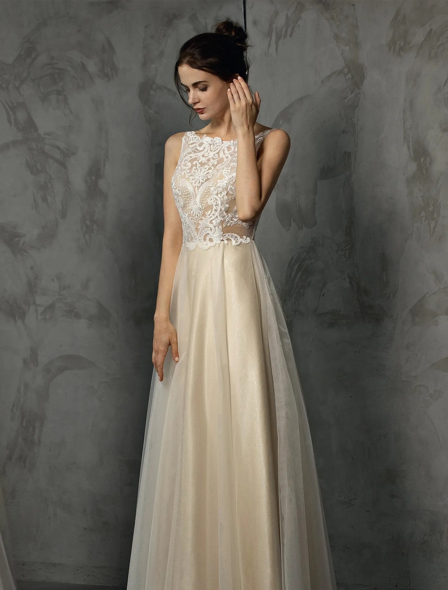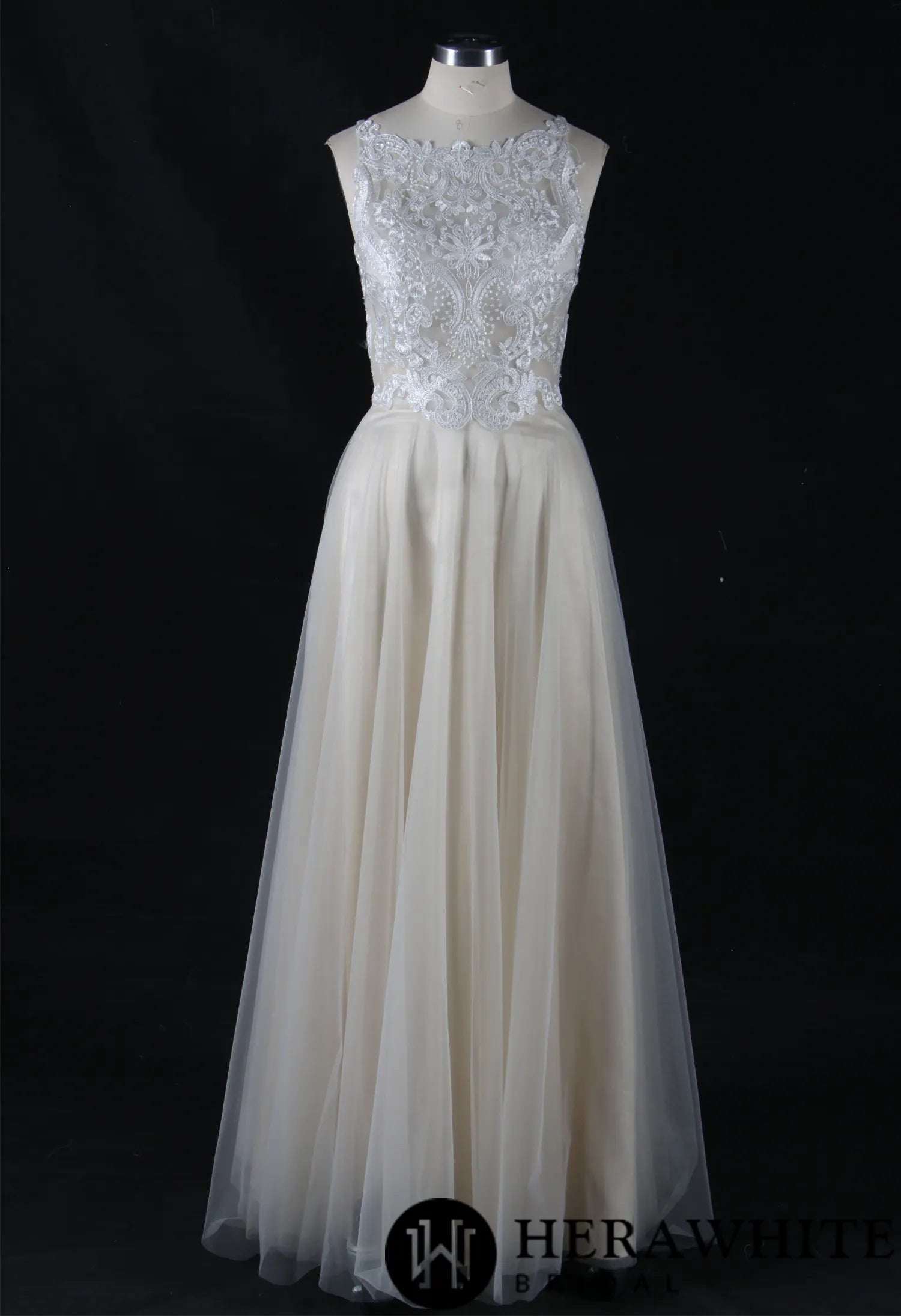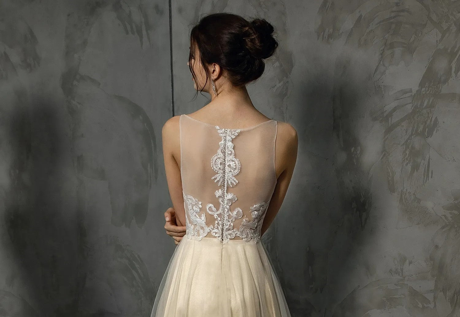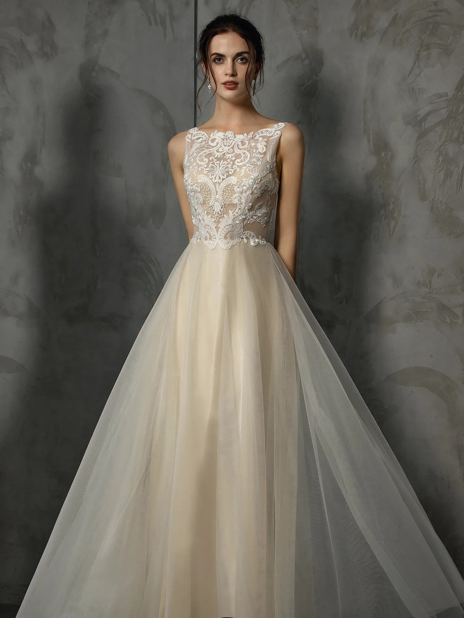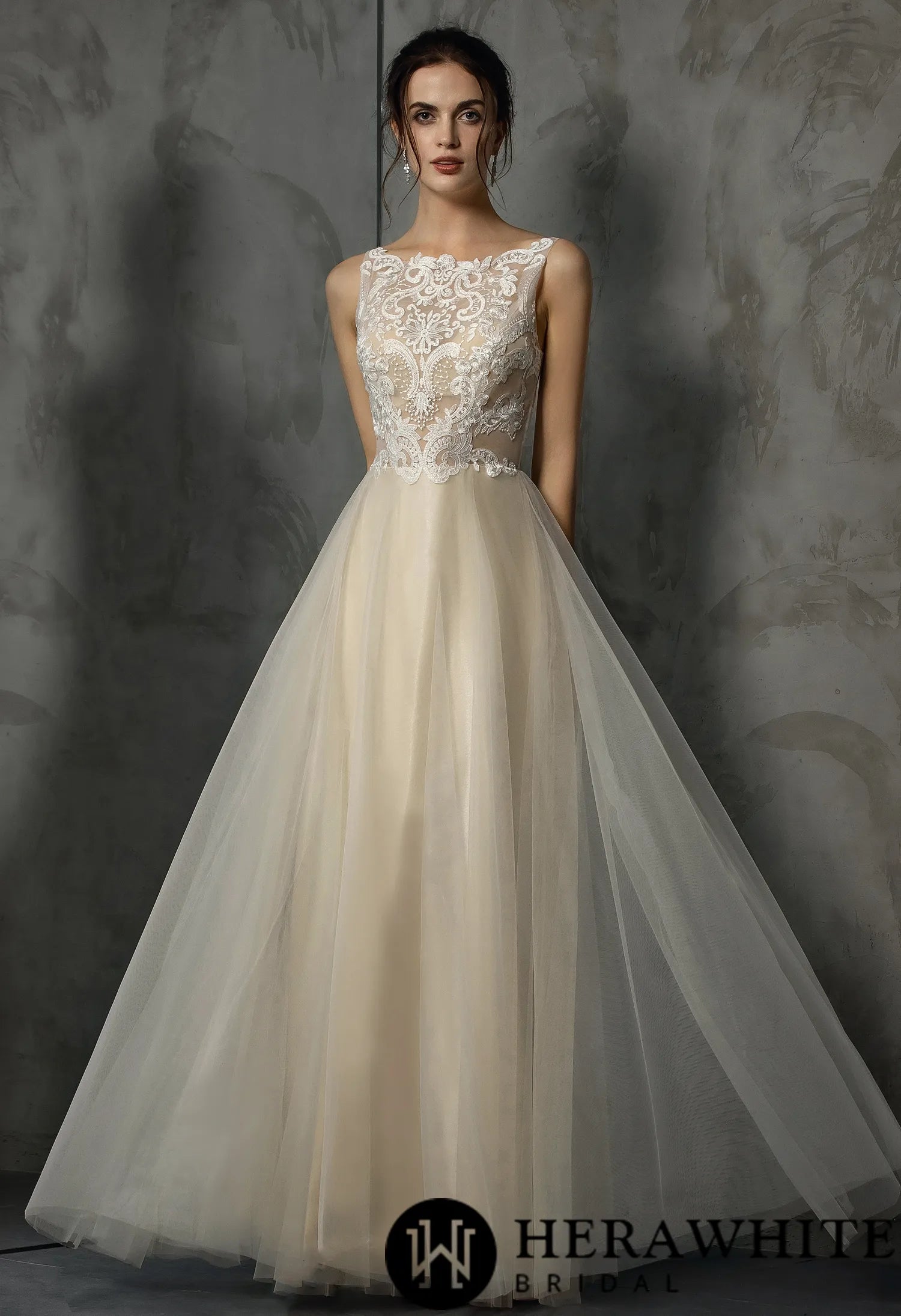 A-Line Bridal Gown With Delicate Applique. The bridal gown is accented by a bateau, gorgeous neckline and frosted lace appliquès adorn the bodice of this beautiful wedding gown. A plunging illusion back adds the perfect touch of sparkle to complete the look of this bridal gown with an A-line silhouette.