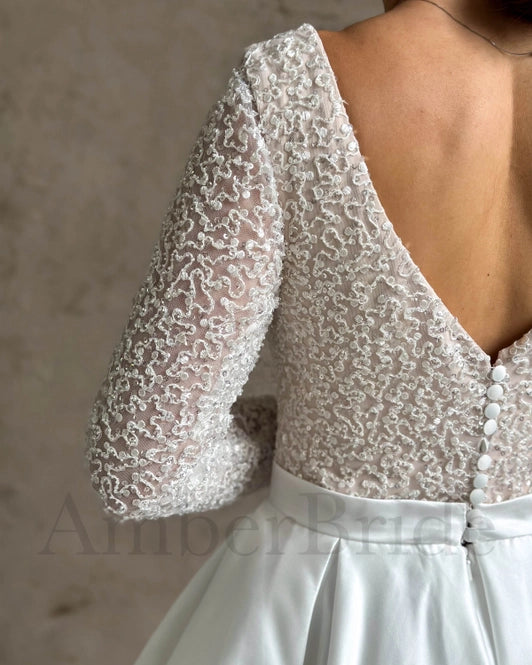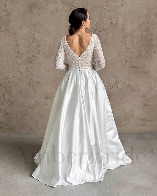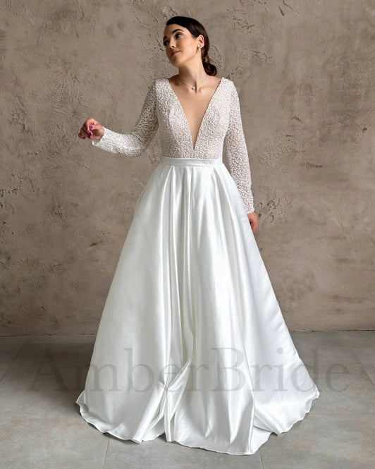 Enhance your special day in this timelessly glamorous A-line wedding dress. Crafted from luxurious satin with a train and exquisite detailing, this dress is an elegant addition to your nuptials. The long sleeves and deep V-neckline offer a flattering fit, while the V-shaped open back and buttons provide an extra touch of sophistication.