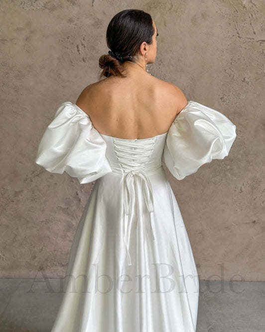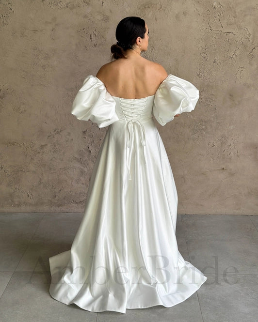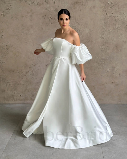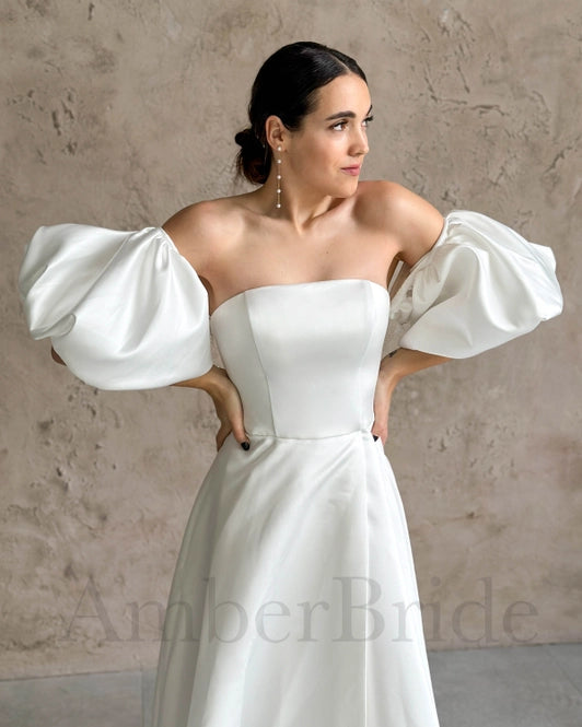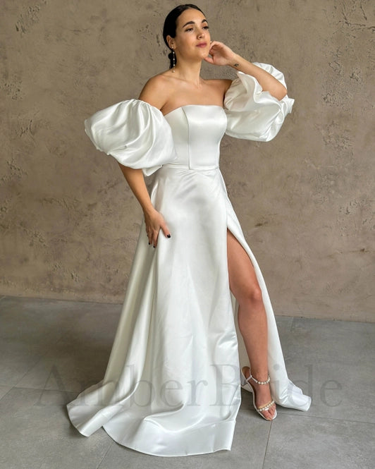 Elevate your bridal look with this elegant A-line wedding dress, showcasing a simple yet stunning design. The strapless corset bodice provides a structured silhouette, while the clean lines and minimalist style exude timeless charm. Puffed sleeves add a touch of romance, and a subtle slit offers a hint of allure. Crafted from luxurious satin, this wedding gown is the epitome of understated beauty, perfect for the bride who appreciates the grace in simplicity.
