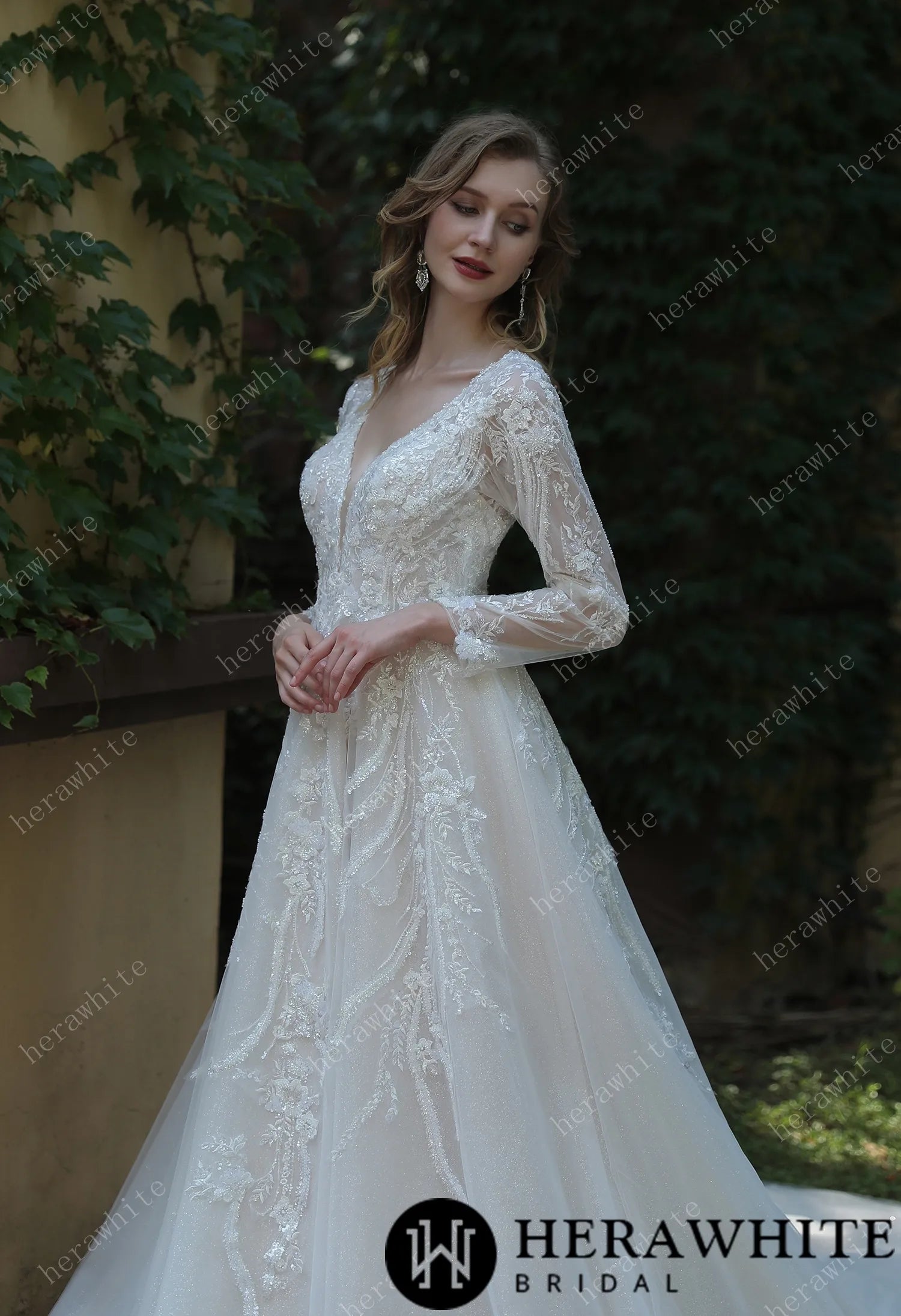 A Timeless Lace A-Line Gown With Plunging V-Neck. Perfect for a romantic outdoor ceremony, this enchanting A-line wedding dress features a plunging V-neckline with long sleeves and an open keyhole back. The gown is adorned with beaded lace appliques that sparkle throughout the skirt and form a romantic hem lace along the cathedral-length train.