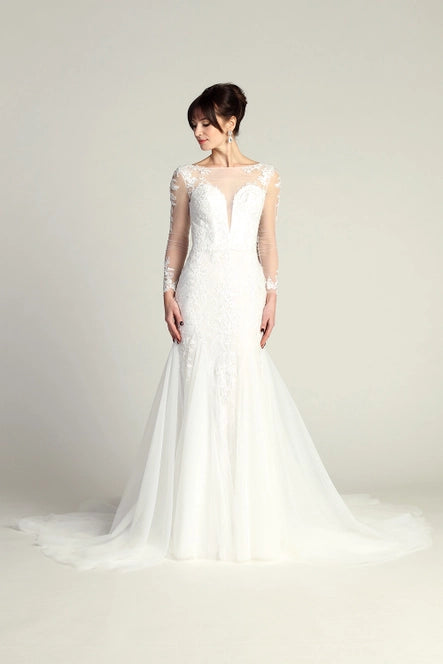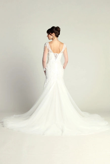 Step into timeless elegance with our stunning Mermaid Gown, a breathtaking masterpiece designed to accentuate your curves with its classic mermaid silhouette. This exquisite mermaid dress wedding-worthy piece features delicate lace detailing, sheer long sleeves, and a deep V-neckline for a touch of allure. Perfect for romantic evenings, bridal events, or any occasion where you want to make a lasting impression, this gown combines sophistication with irresistible charm.