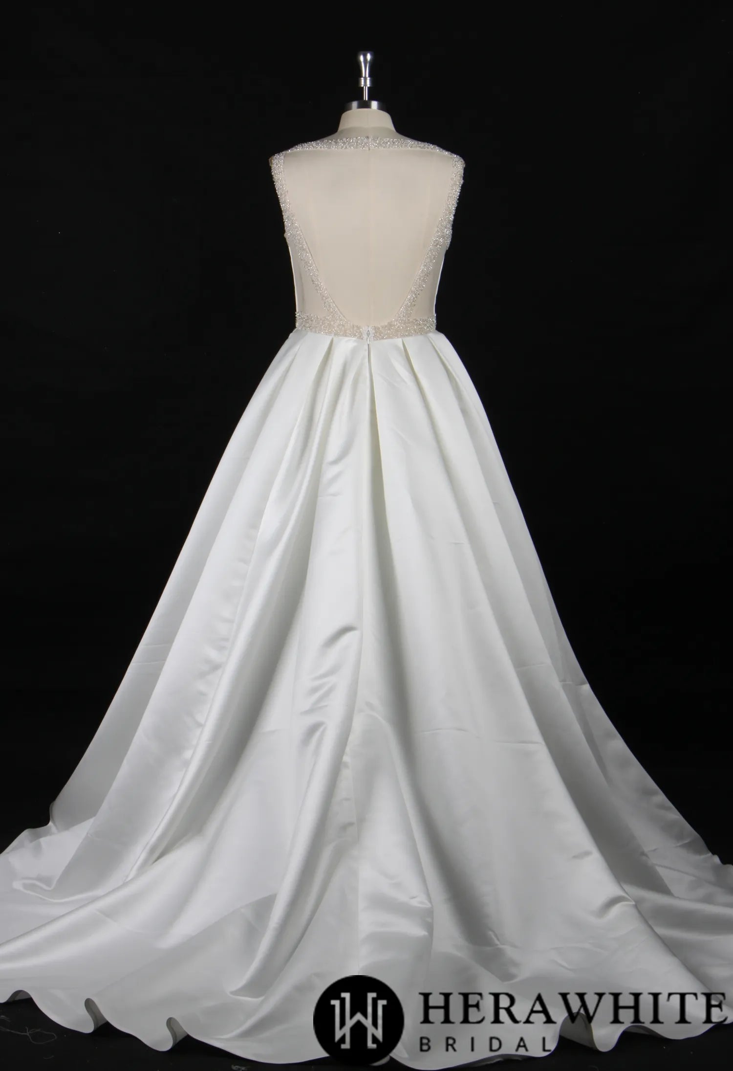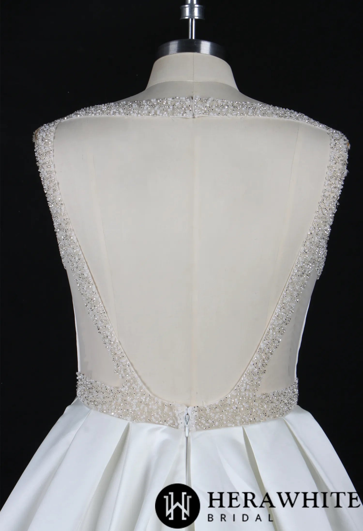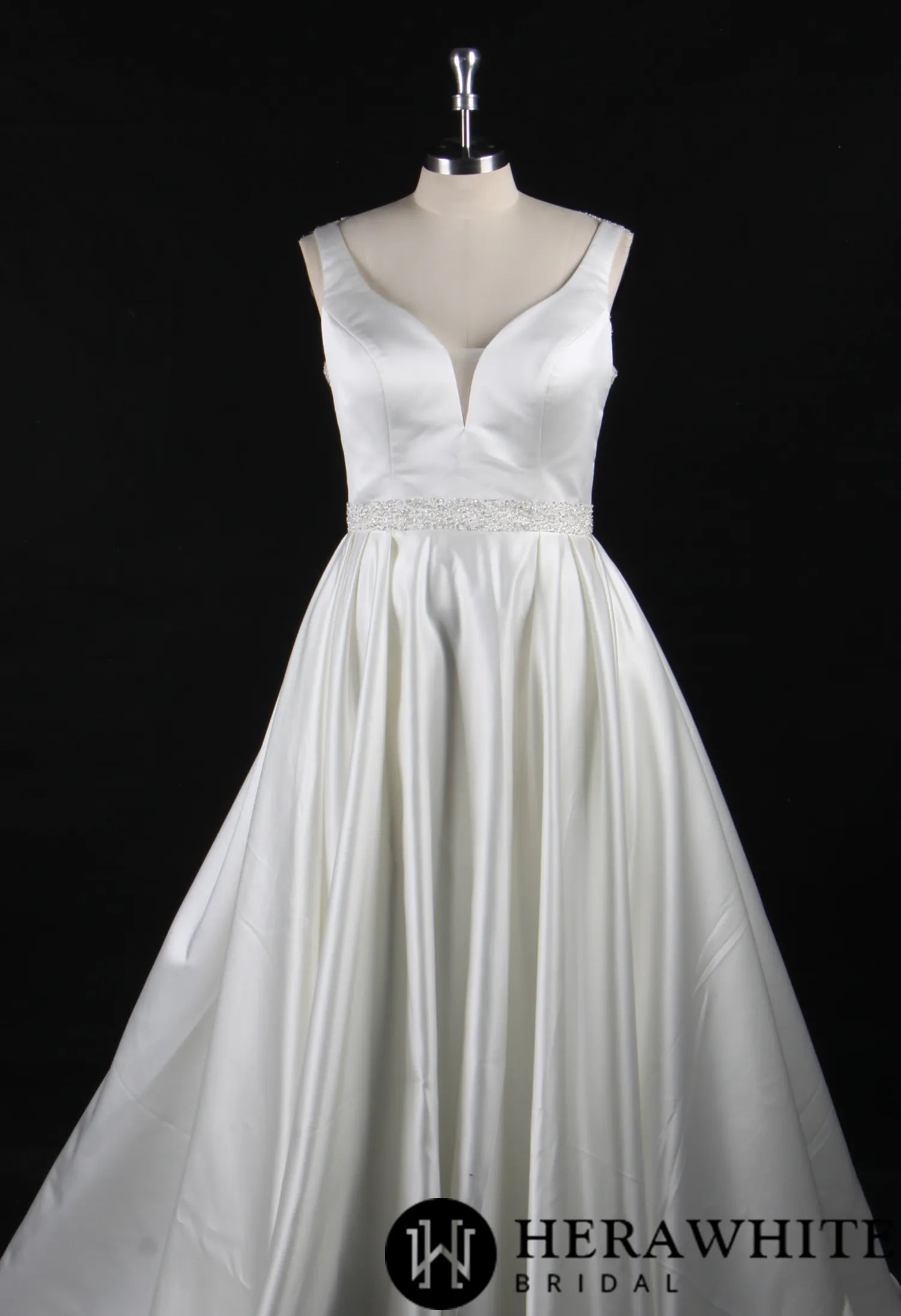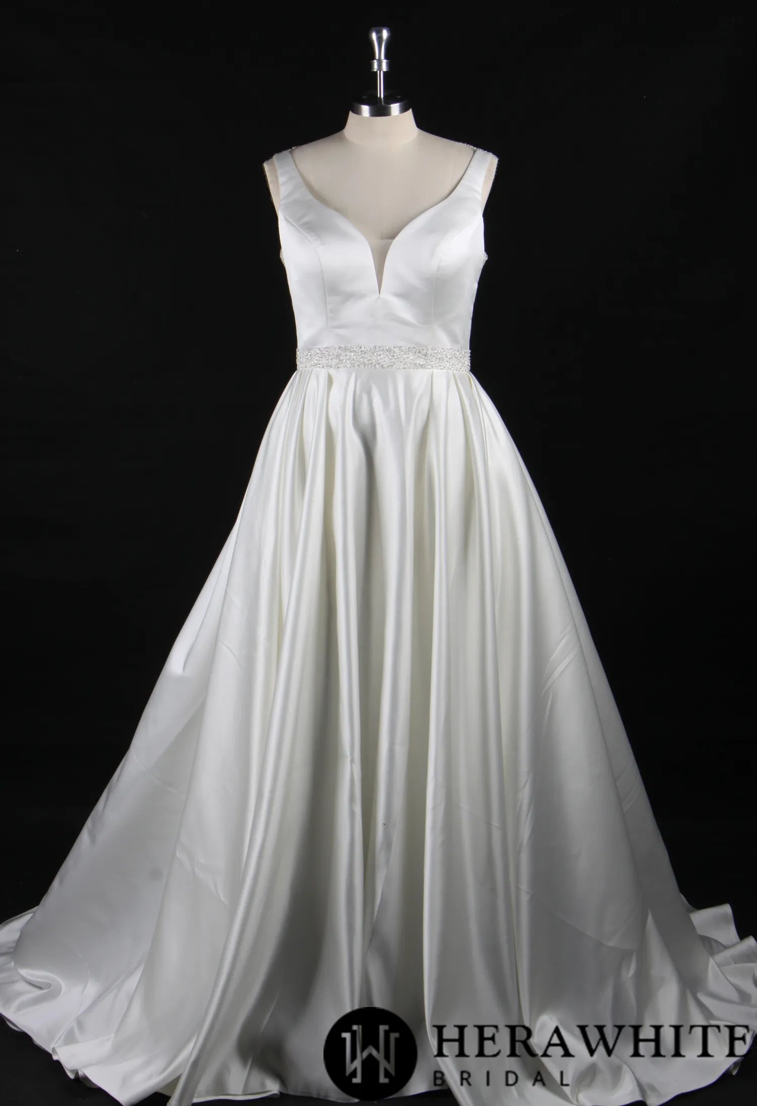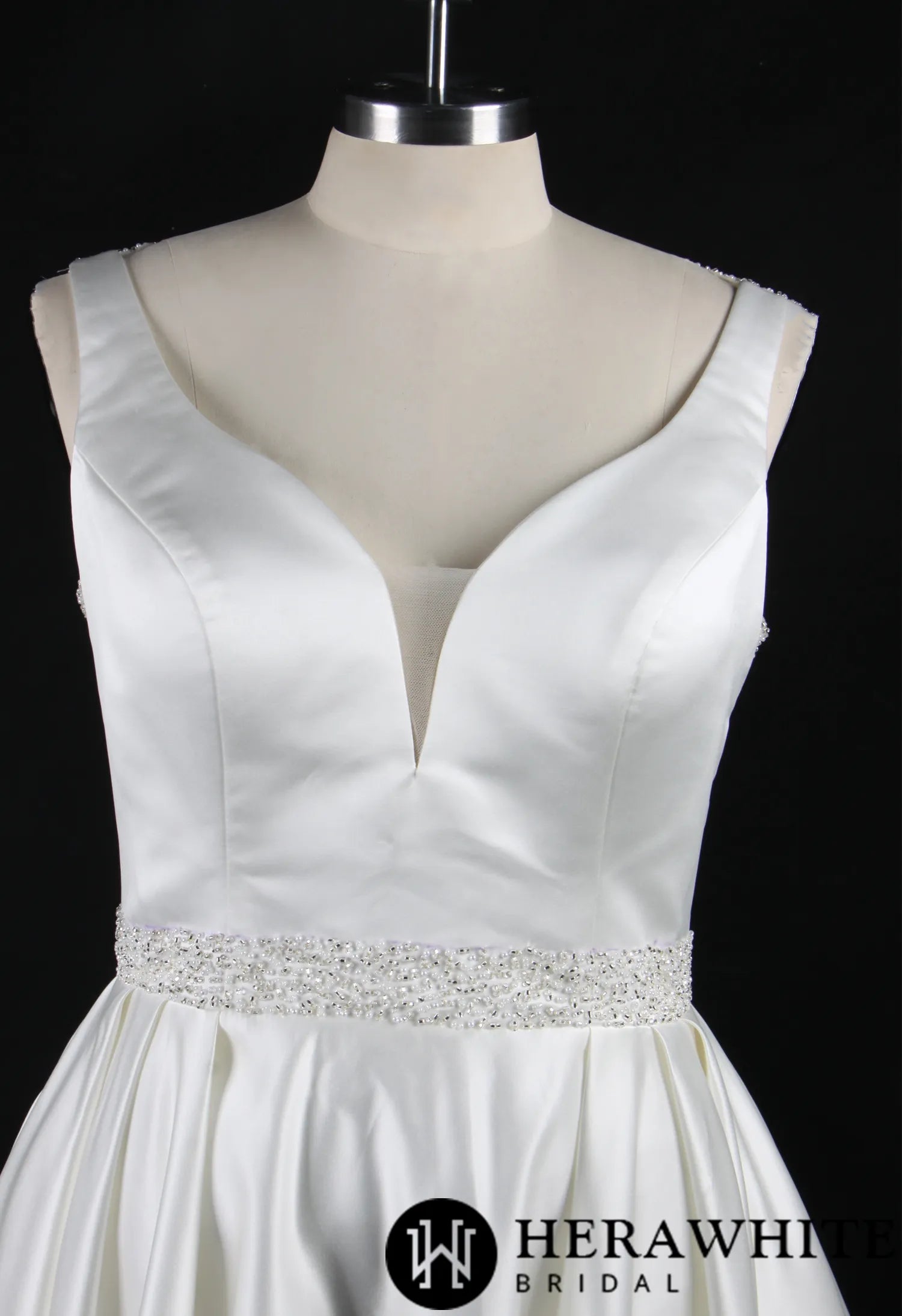 Classic V-Neck Princess Silhouette Beaded Belt Wedding Dress. Crafted from luxurious satin with delicate lining, this dress showcases intricate beadings and a stunning keyhole back, complete with a beautiful beaded belt for a touch of elegance and sophistication.