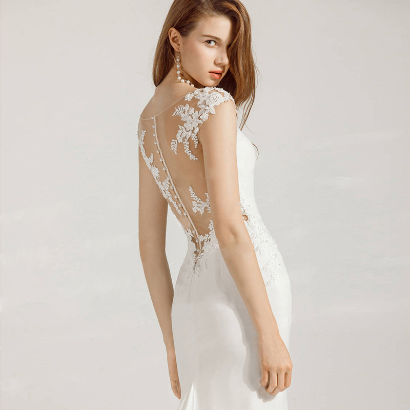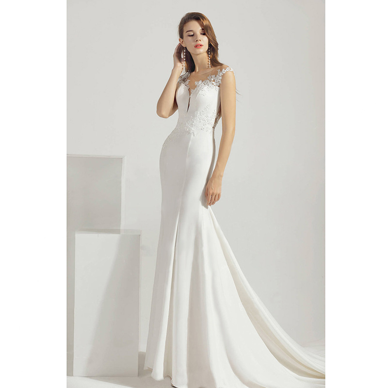 This romantic wedding gown features a sheer lace top with a V-neckline and a classic fishtail train to make a stunning entrance on your special day. With exquisite detail and timeless style, this gown is sure to make a lasting impression.