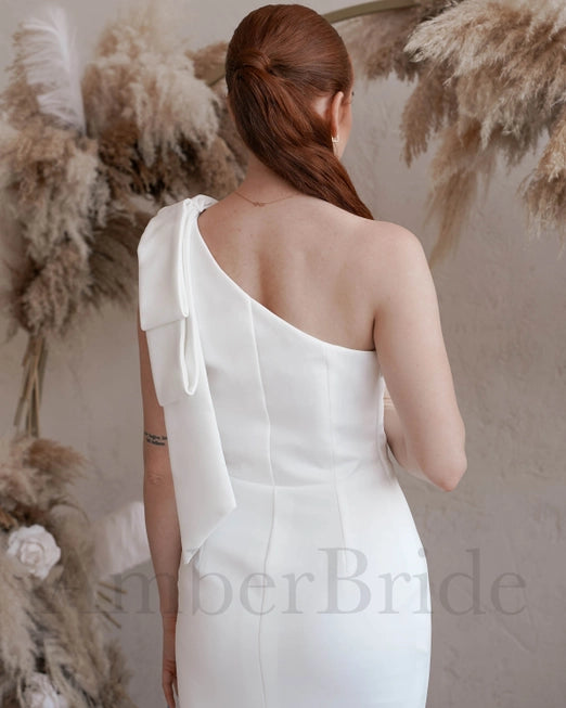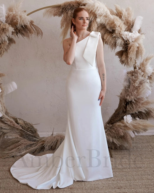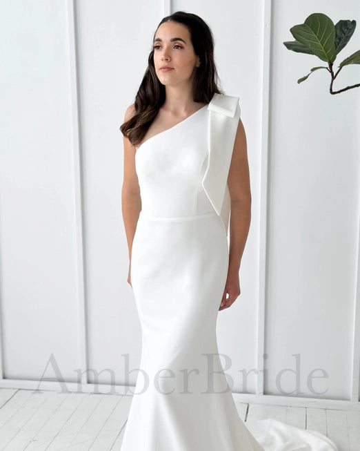 This stunning wedding dress is the epitome of simple elegance. Made with high-quality crepe satin, this mermaid-style dress is sure to turn heads. The one-shoulder design creates a chic and modern look, while the bow on the shoulder adds a touch of sophistication. The sleek silhouette of the dress hugs the curves in all the right places, creating a beautiful and flattering fit. The crepe satin fabric gives the dress a luxurious and smooth feel, making it comfortable to wear all day and night. This beautiful dress is perfect for any bride looking for a simple yet elegant wedding dress that will make her feel confident and beautiful on her special day.