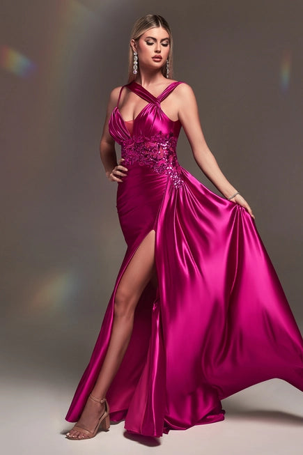 Make a statement at your next special occasion with this stunning fitted satin gown. Made from luxurious satin fabric, this gown is designed to hug every curve of your body and provide a comfortable fit. The standout feature is the lace embellished waistline – which brings an element of sophistication while being incredibly eye-catching. And, the gathered bust and asymmetrical straps is sure to add interest and femininity to your look. Our favorite detail? The leg slit atop the booty ruching! Finally, the side satin sash detail lets you tie it all together for the perfect finishing touch. From prom to weddings, or any other formal event – this satin gown will make you feel sexy and glamorous.