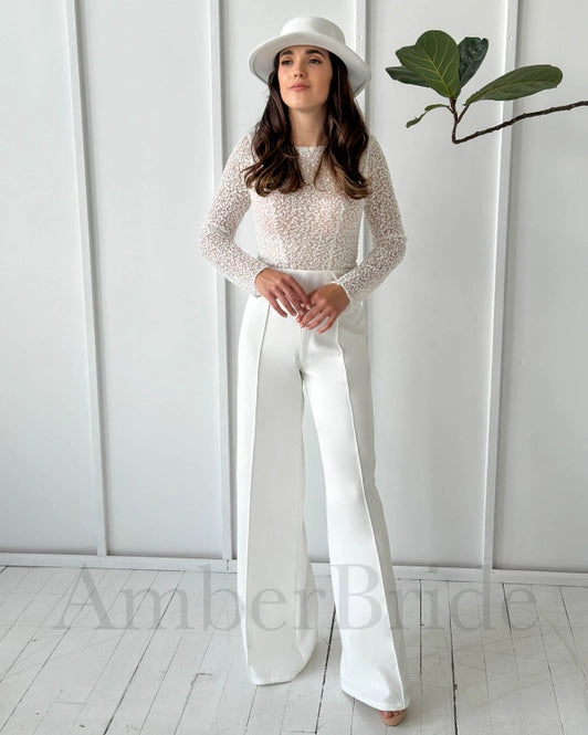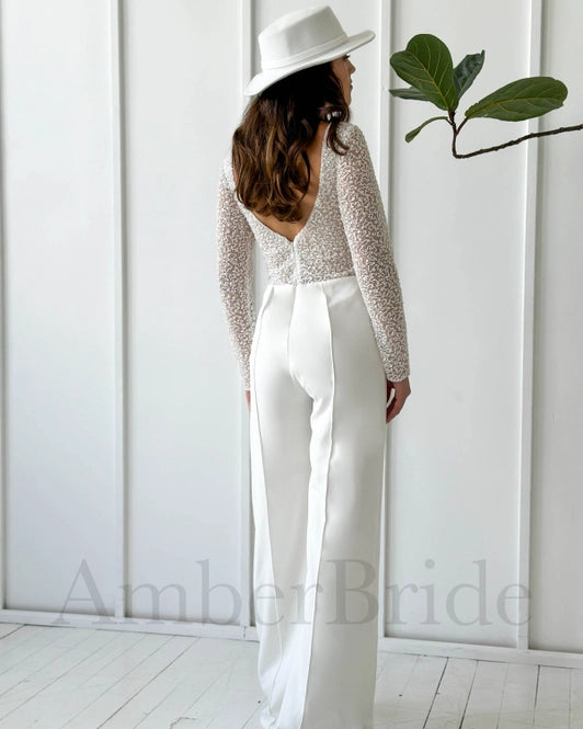 Elevate your wardrobe with this stunning jumpsuit with sleeves, designed to make you stand out at any event. Perfect for jumpsuits for a wedding guest, this chic and sophisticated piece features a luxe satin fabric, a flattering U-neckline, and a bold V-shaped open back for a touch of allure. Whether you're dressing up for a special occasion or adding a timeless piece to your collection, this jumpsuit ensures effortless elegance.