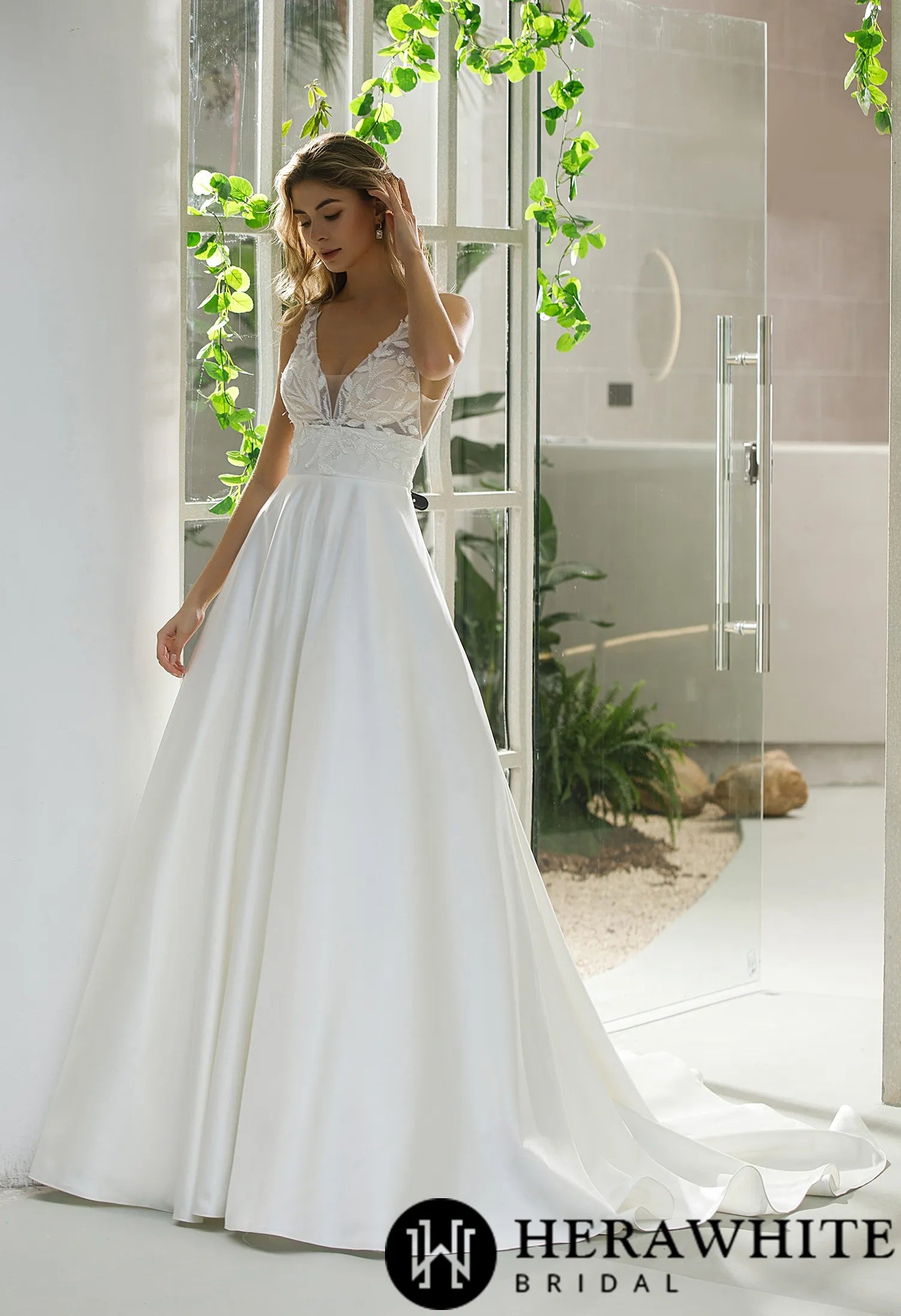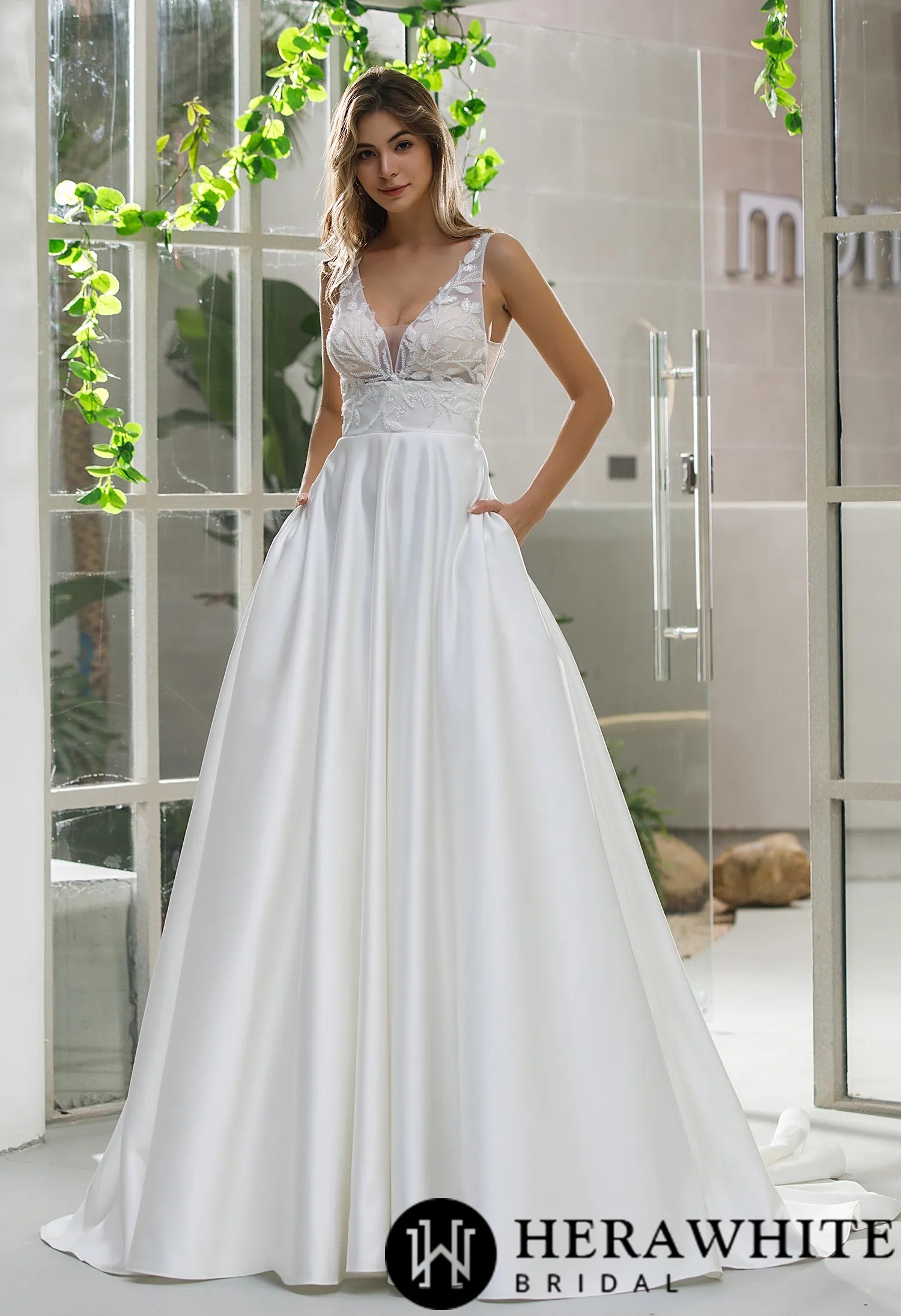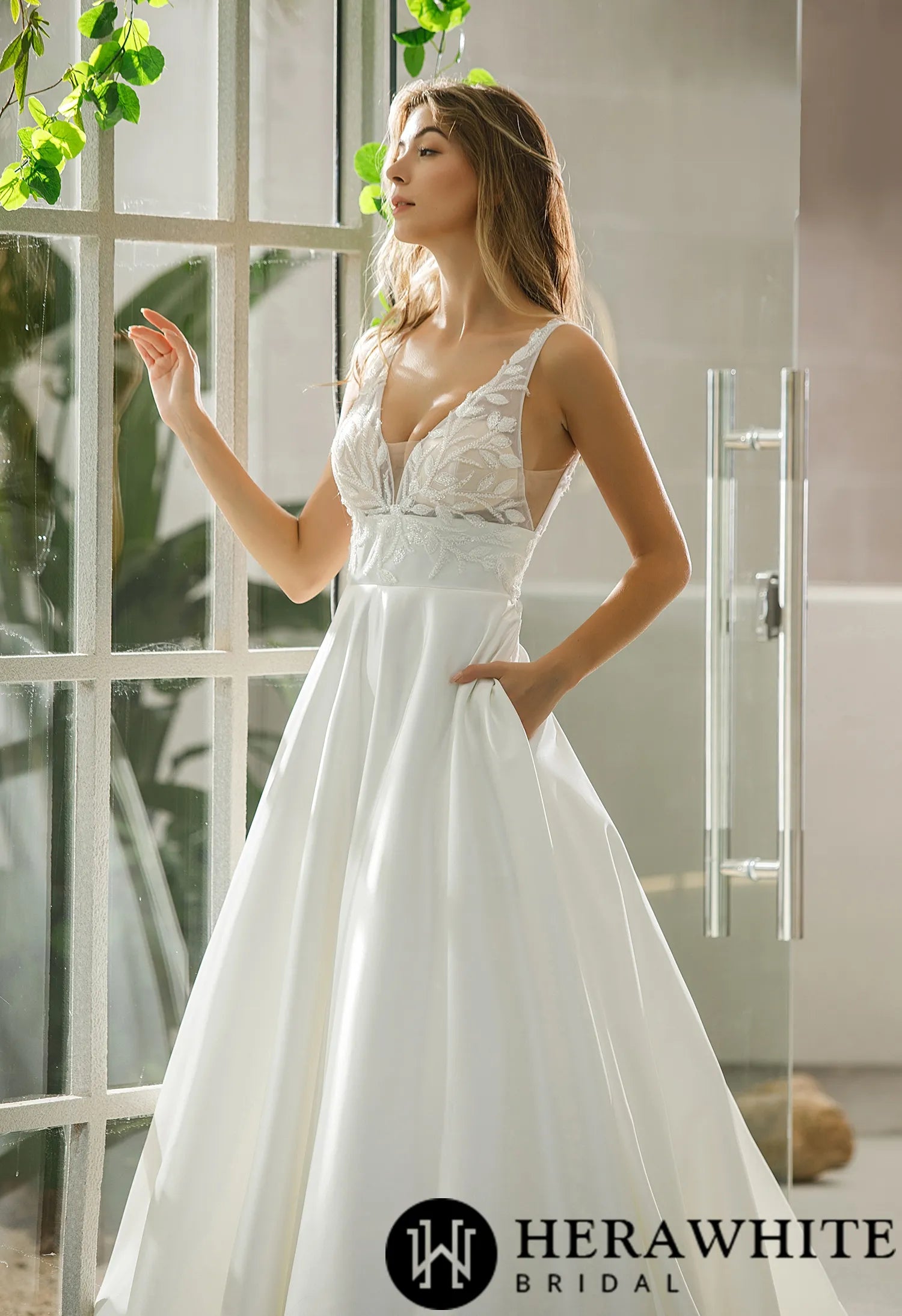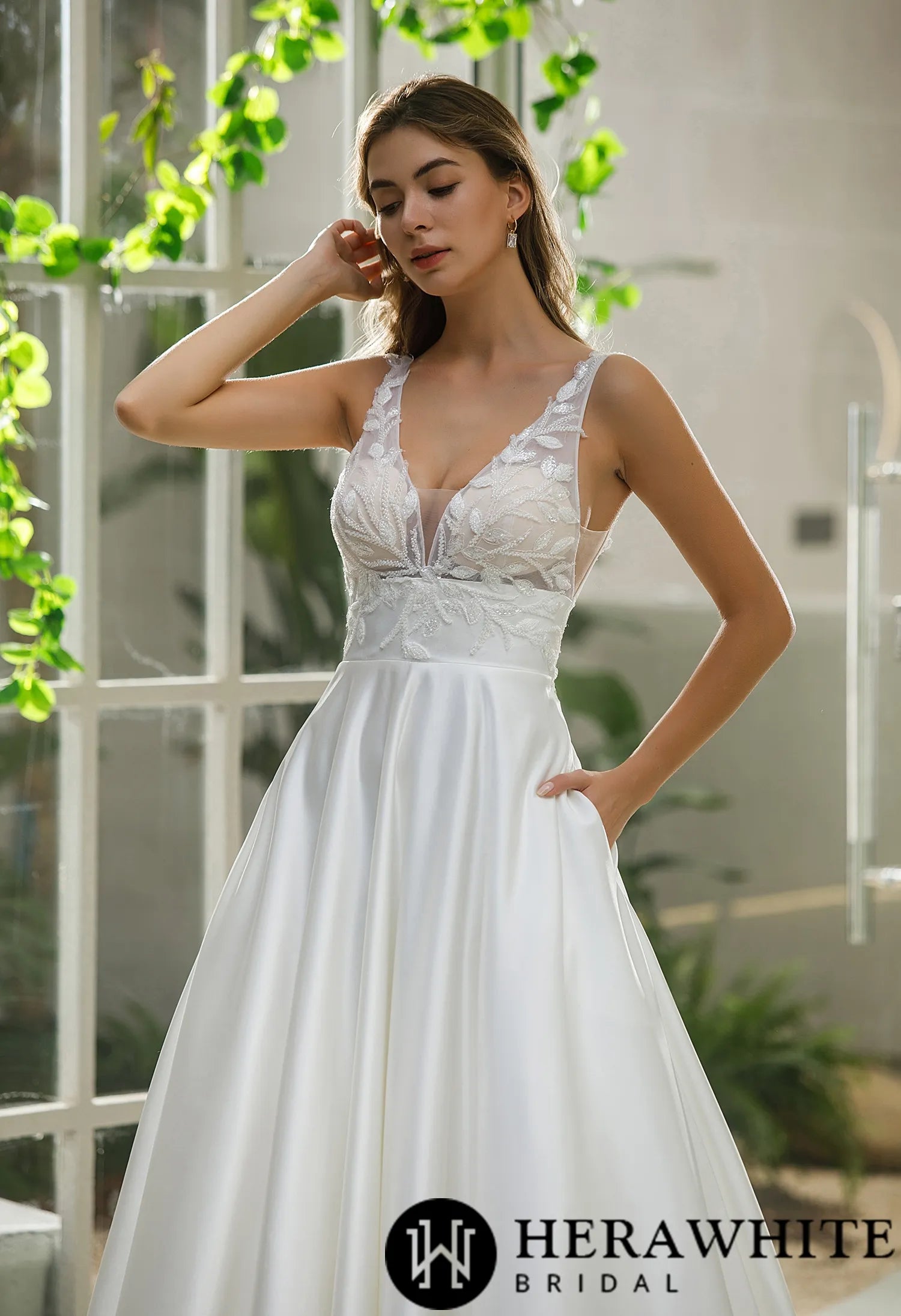 Make a stunning entrance on your special day with this elegant A-line bridal gown, designed to blend timeless sophistication with modern comfort. Featuring a flattering long sleeve bridal dress design, this satin masterpiece boasts an illusion bodice adorned with delicate beaded leaf patterns, creating a romantic and ethereal look. The classic A-line silhouette enhances your natural curves, while the deep V-neckline and empire waist add a touch of contemporary elegance. Plus, the hidden pockets offer both style and practicality—perfect for keeping small essentials close as you walk down the aisle.