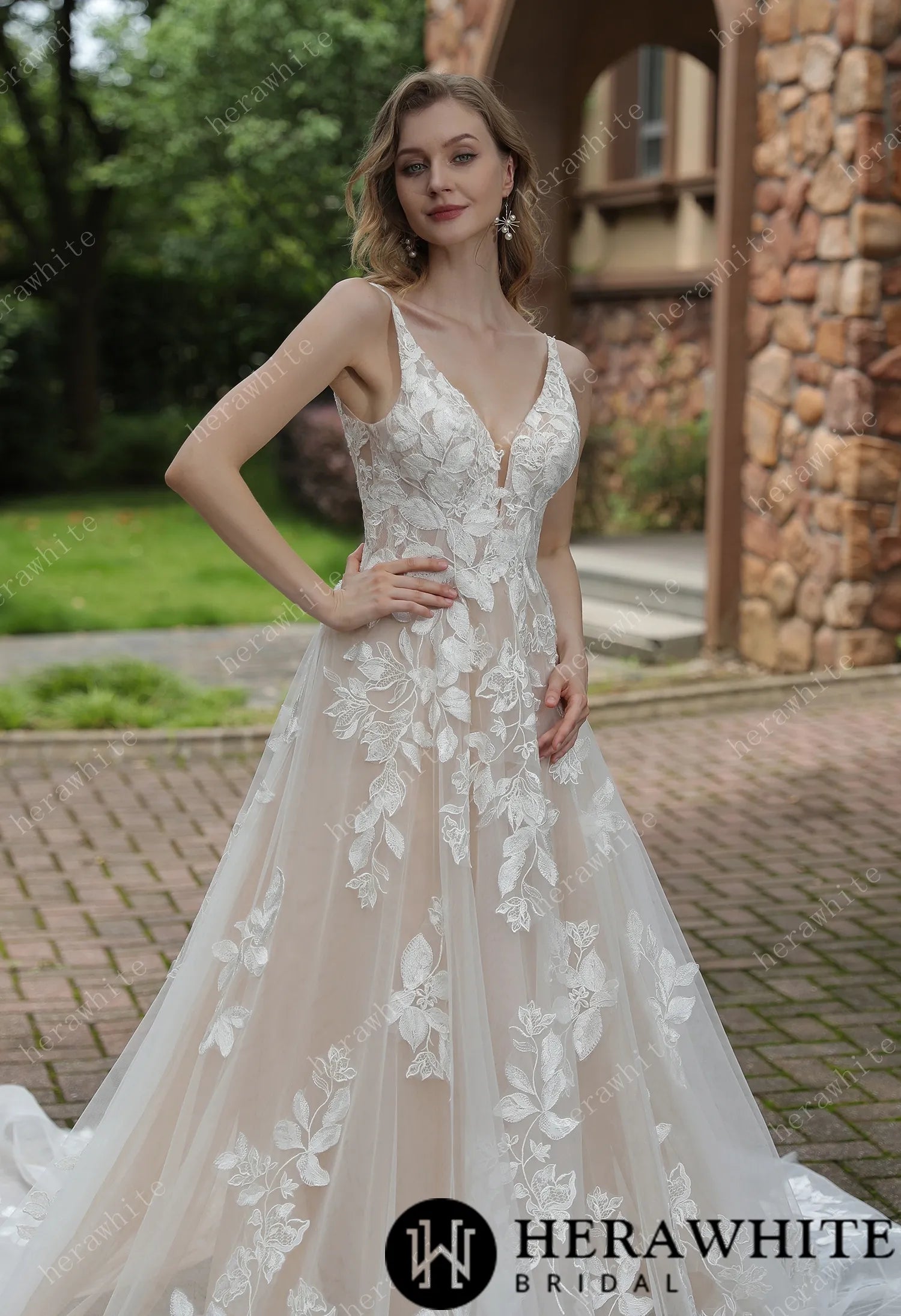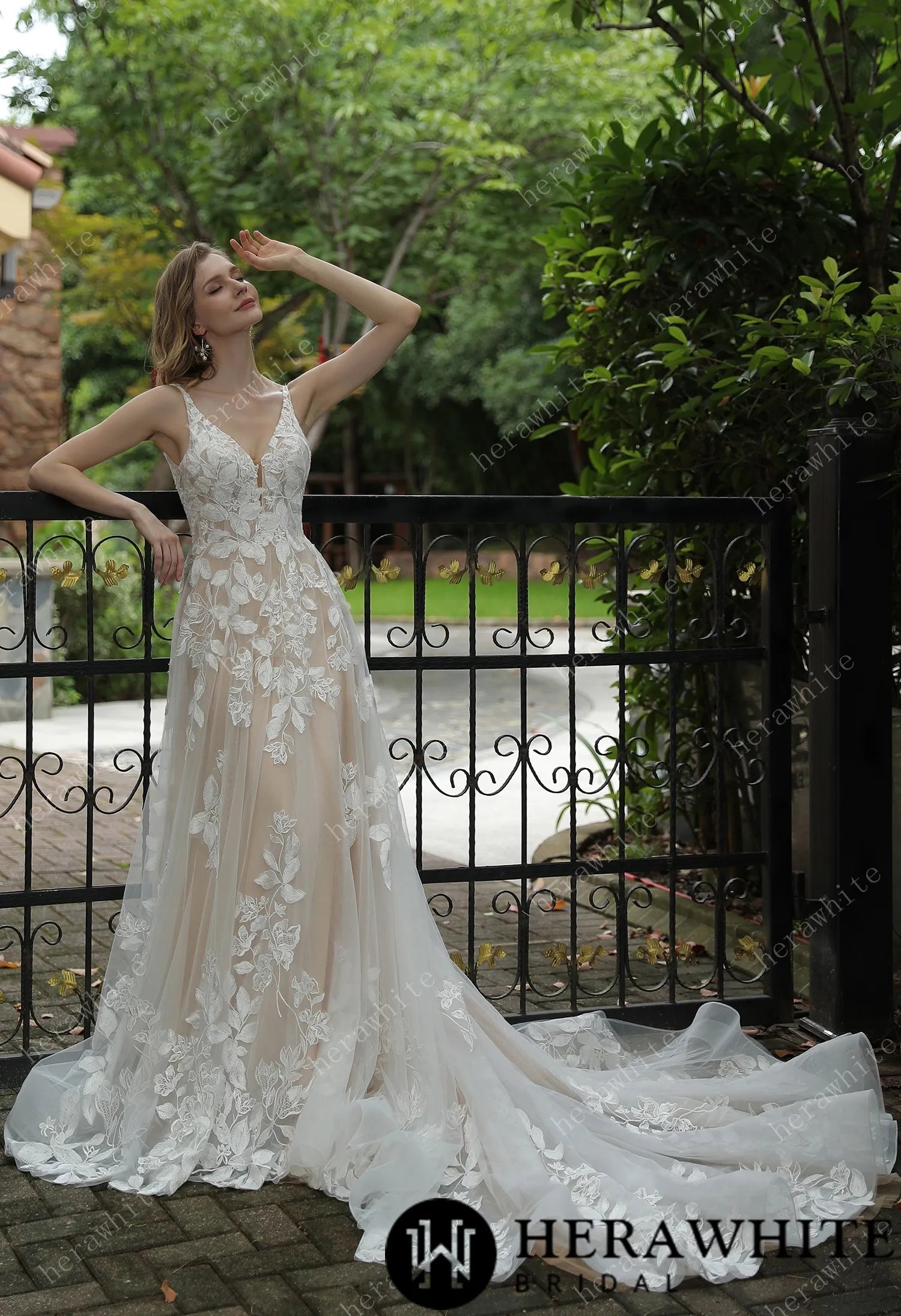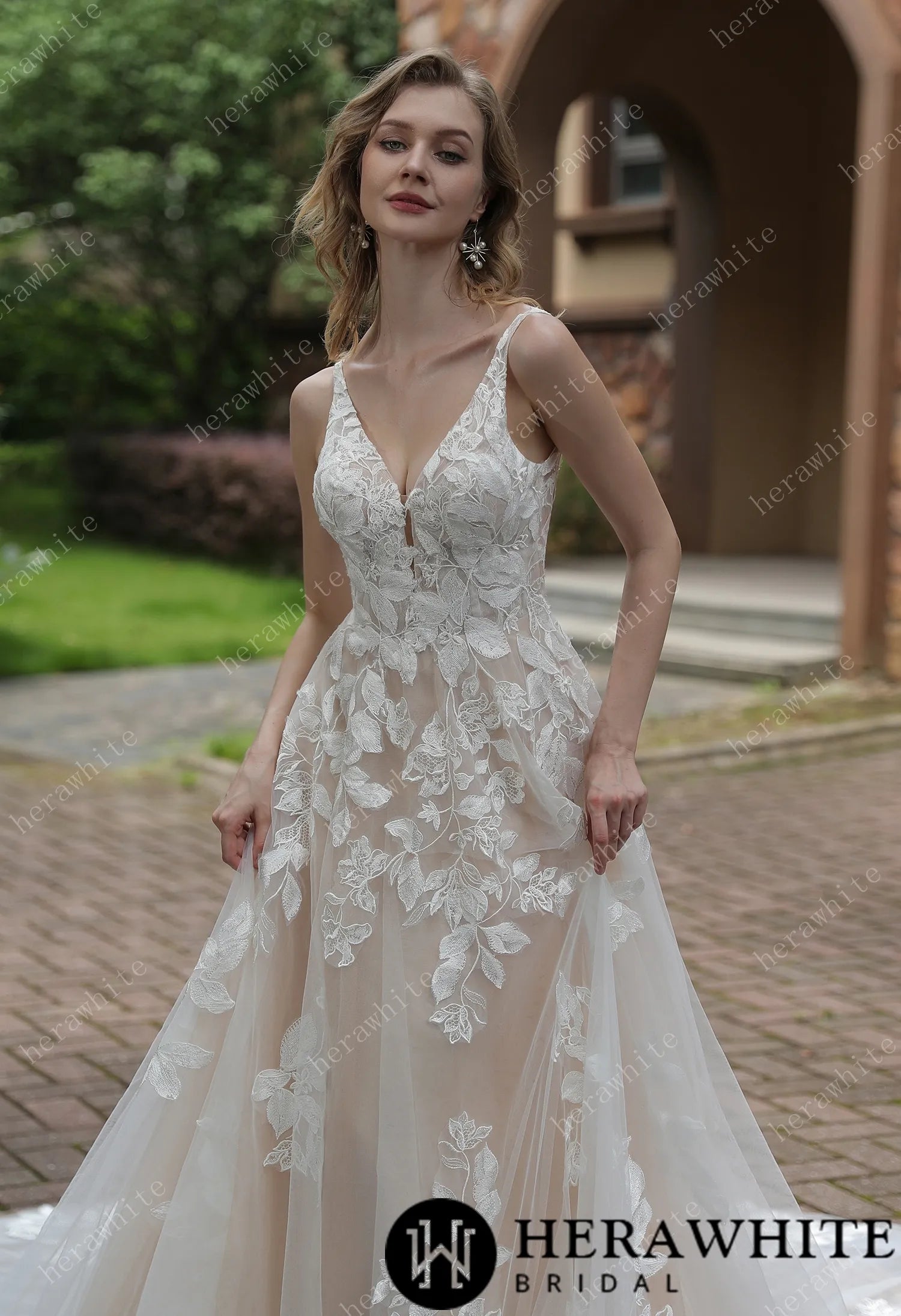 Luxurious Floral Lace A-Line Wedding Gown. This wedding dress features a luxurious bold floral patterned lace from the sheer lace shoulder straps to the enchanting tulle and lace train that is sure to catch everyone's attention. With its elegant V-neck and illusion detailing, this romantic A-line gown exudes a modern classic charm. The sheer train adorned with intricate lace arrangement adds a touch of grandeur, making it a showstopper as you walk down the aisle.