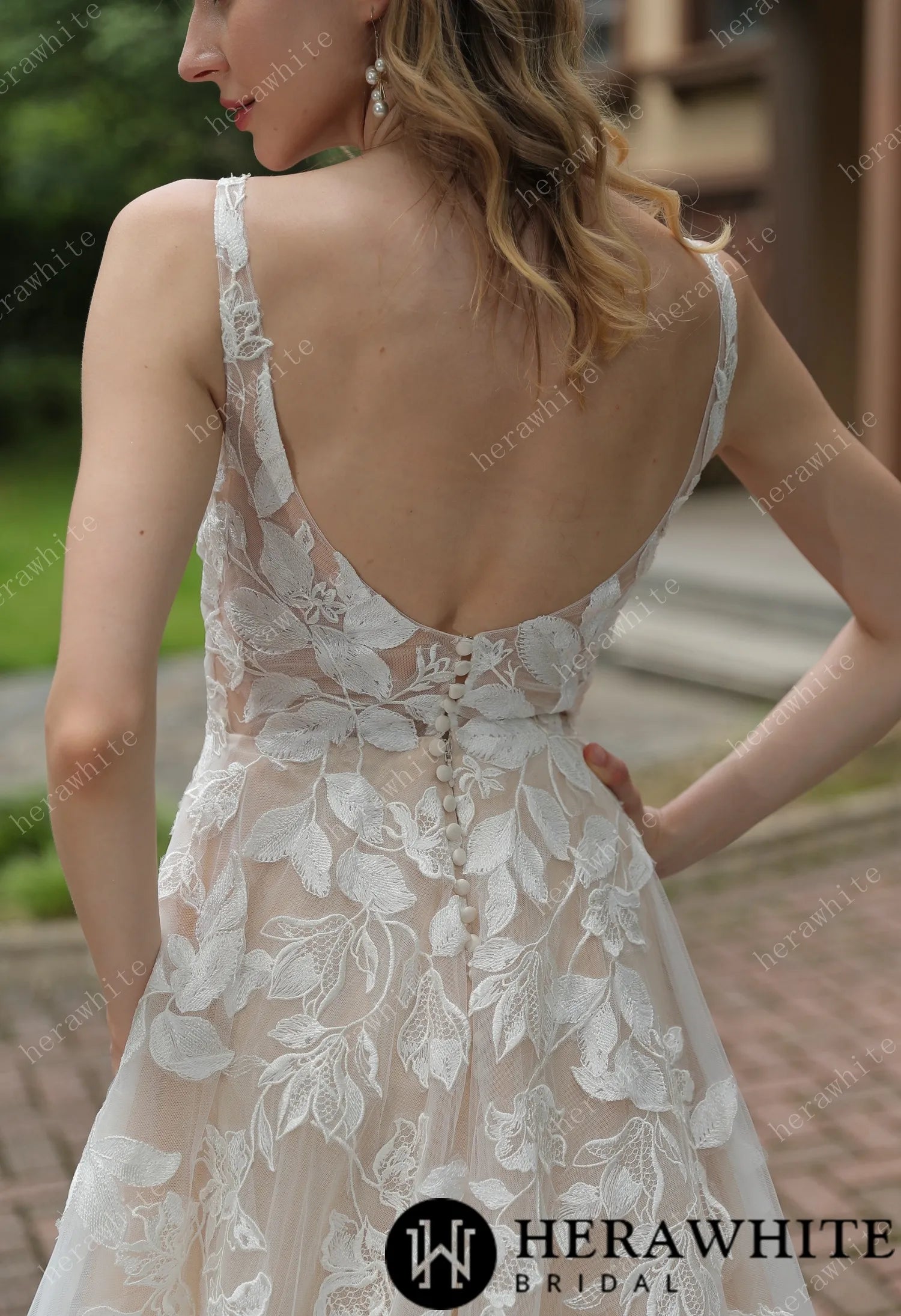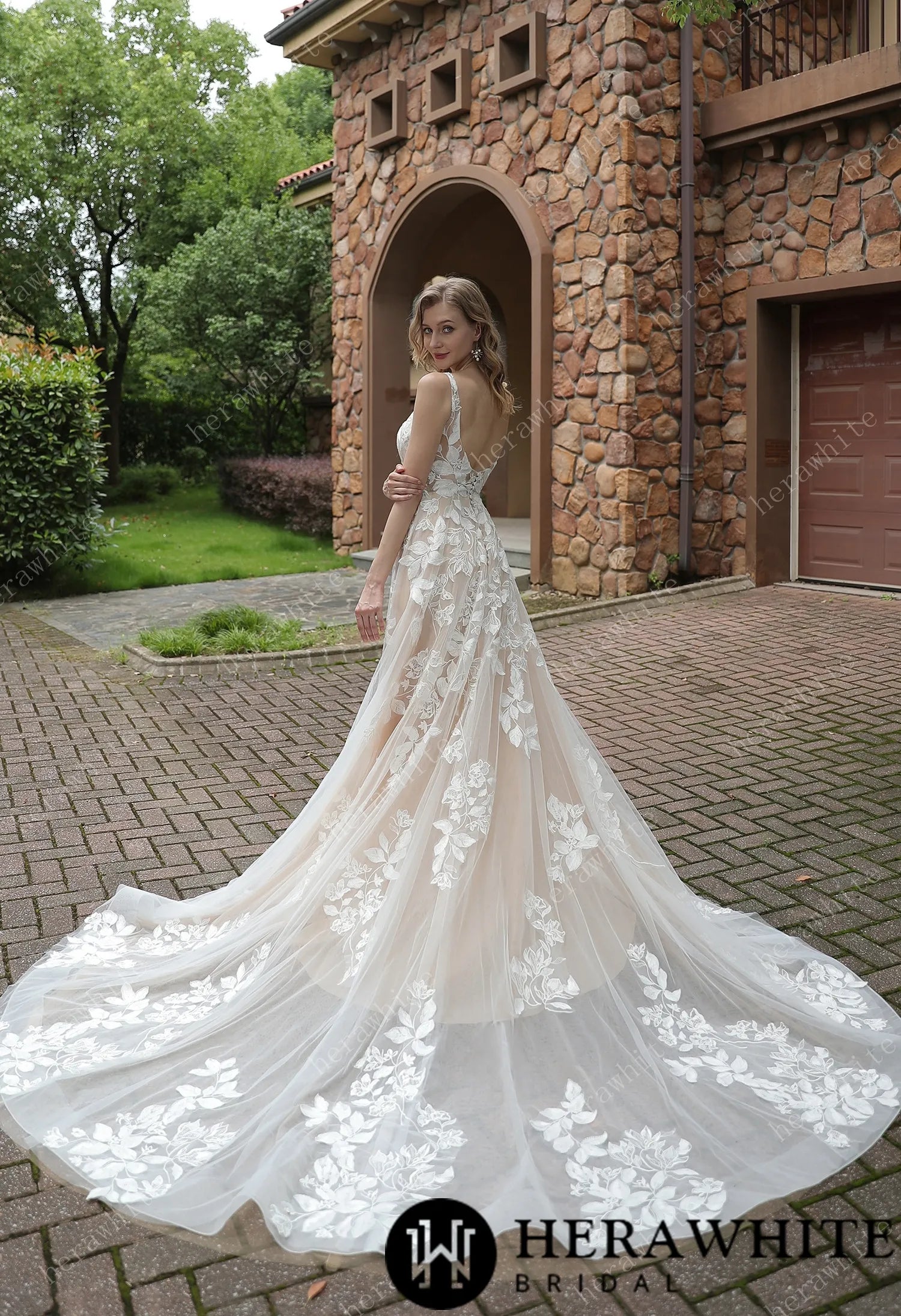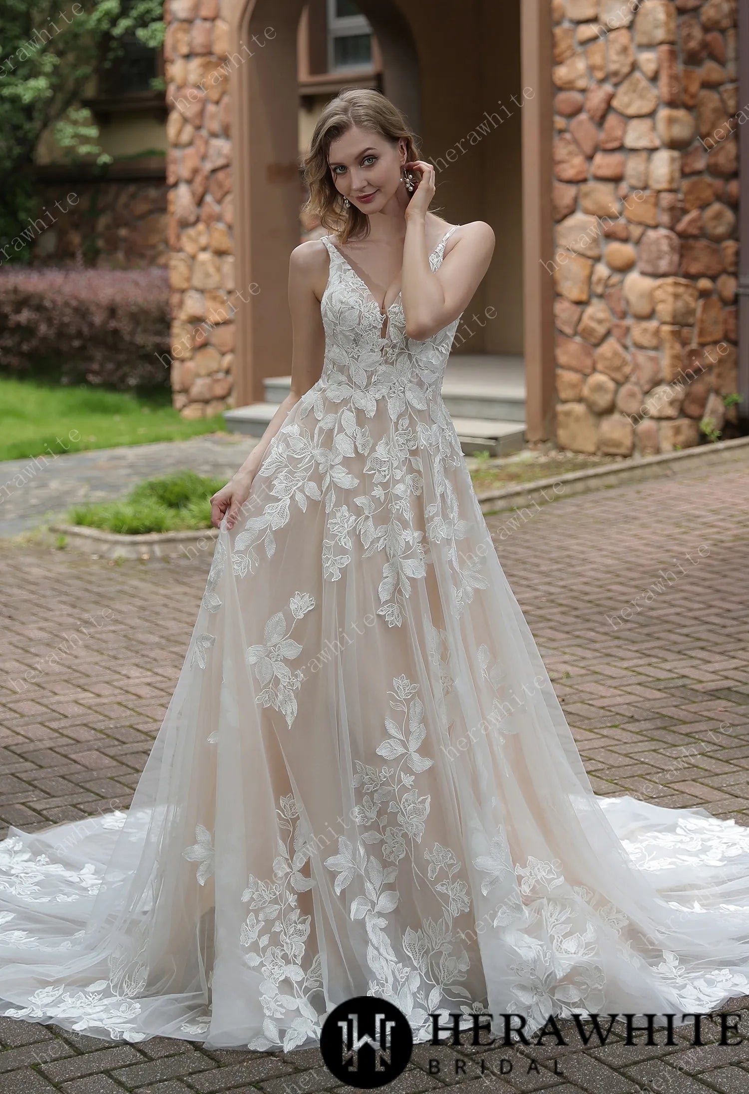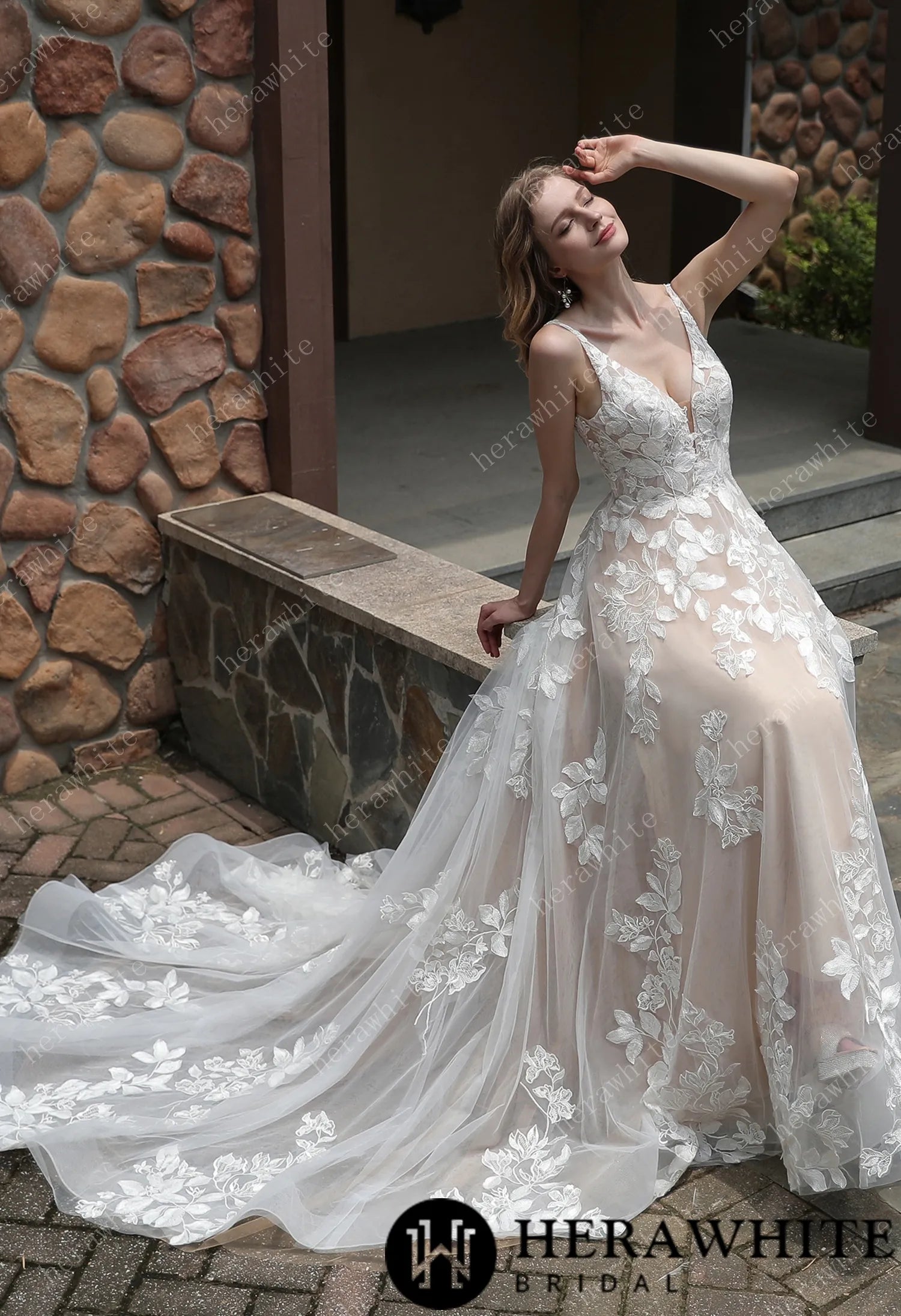 Luxurious Floral Lace A-Line Wedding Gown. This wedding dress features a luxurious bold floral patterned lace from the sheer lace shoulder straps to the enchanting tulle and lace train that is sure to catch everyone's attention. With its elegant V-neck and illusion detailing, this romantic A-line gown exudes a modern classic charm. The sheer train adorned with intricate lace arrangement adds a touch of grandeur, making it a showstopper as you walk down the aisle.