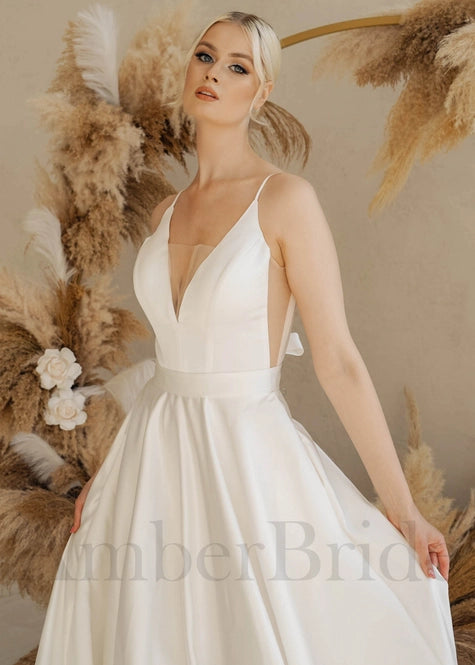Look timelessly elegant on your special day in this exquisite minimalistic A line satin wedding dress. Classic and graceful, this dress features a sleek silhouette, court train, deep V-neckline, spaghetti straps, and a backless design to make a statement. Crafted from luxurious satin, this bridal gown is sure to make your grand entrance into the ceremony an unforgettable one.