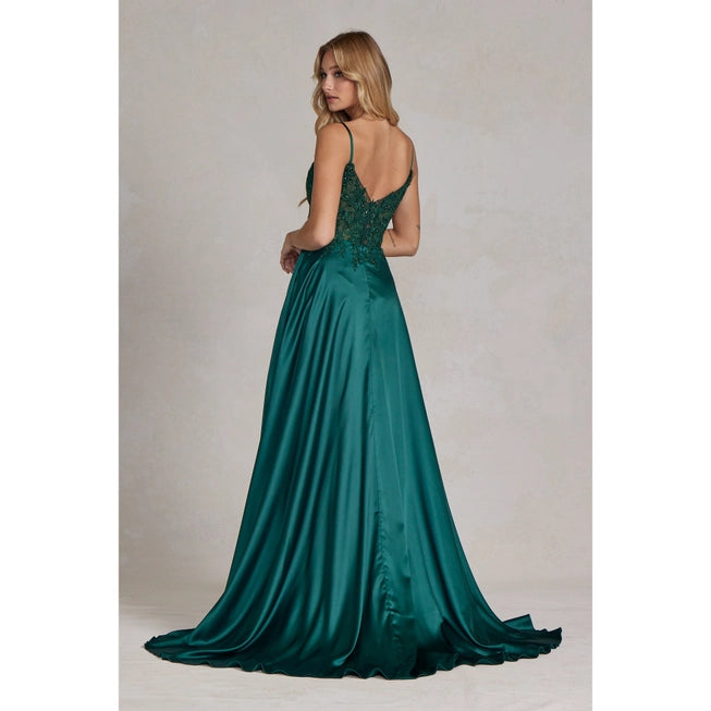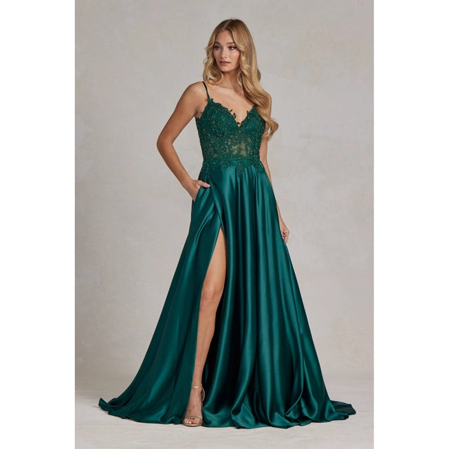 Indulge in luxury with the Noxanabel Dramatic Split prom dress. Featuring a stunning lace sleeveless bodice and a flowing aline skirt with a dramatic split, this dress will make you feel like a true work of art. Effortlessly elegant and sophisticated, it is the perfect addition to your special occasion wardrobe.
