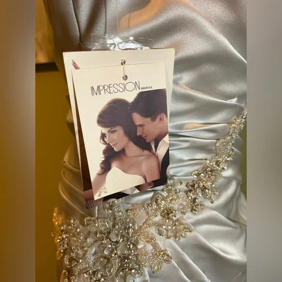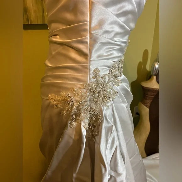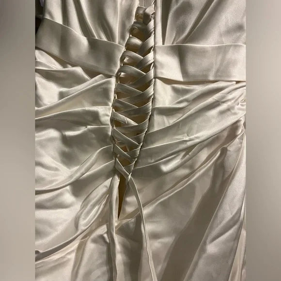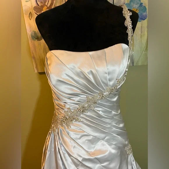 Clearance Sale: Platinum Satin Sleeveless Wedding Gown with ruching, rhinestones & Corset