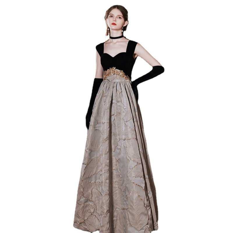 The Hepburn Party Evening Dress is crafted from luxurious fabrics and features a sophisticated slotted collar. The dress is available in a striking Black and Olive color with elegant gold accents and comes in sizes XS to XXL. The high waist and 57-inch/145cm skirt length create an exclusive and tasteful silhouette that exudes elegance.