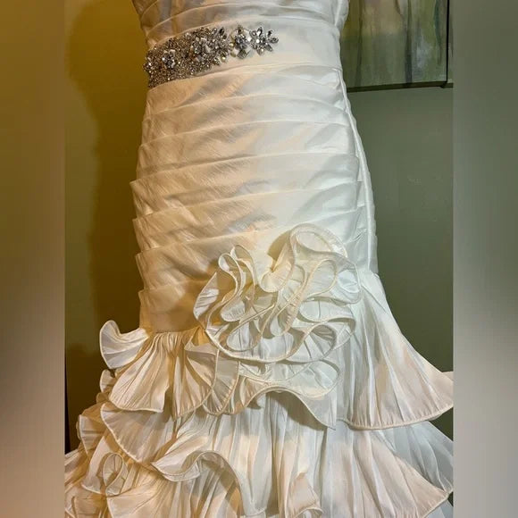 Clearance Sale: Soft Taffeta Mermaid Wedding Gown with Whimsical Layered Skirt and Faux Buttons