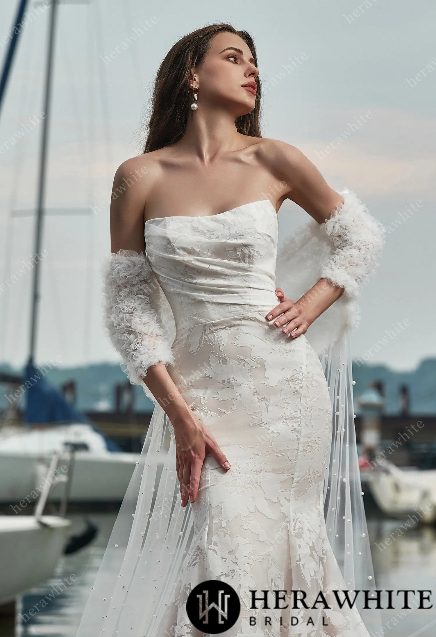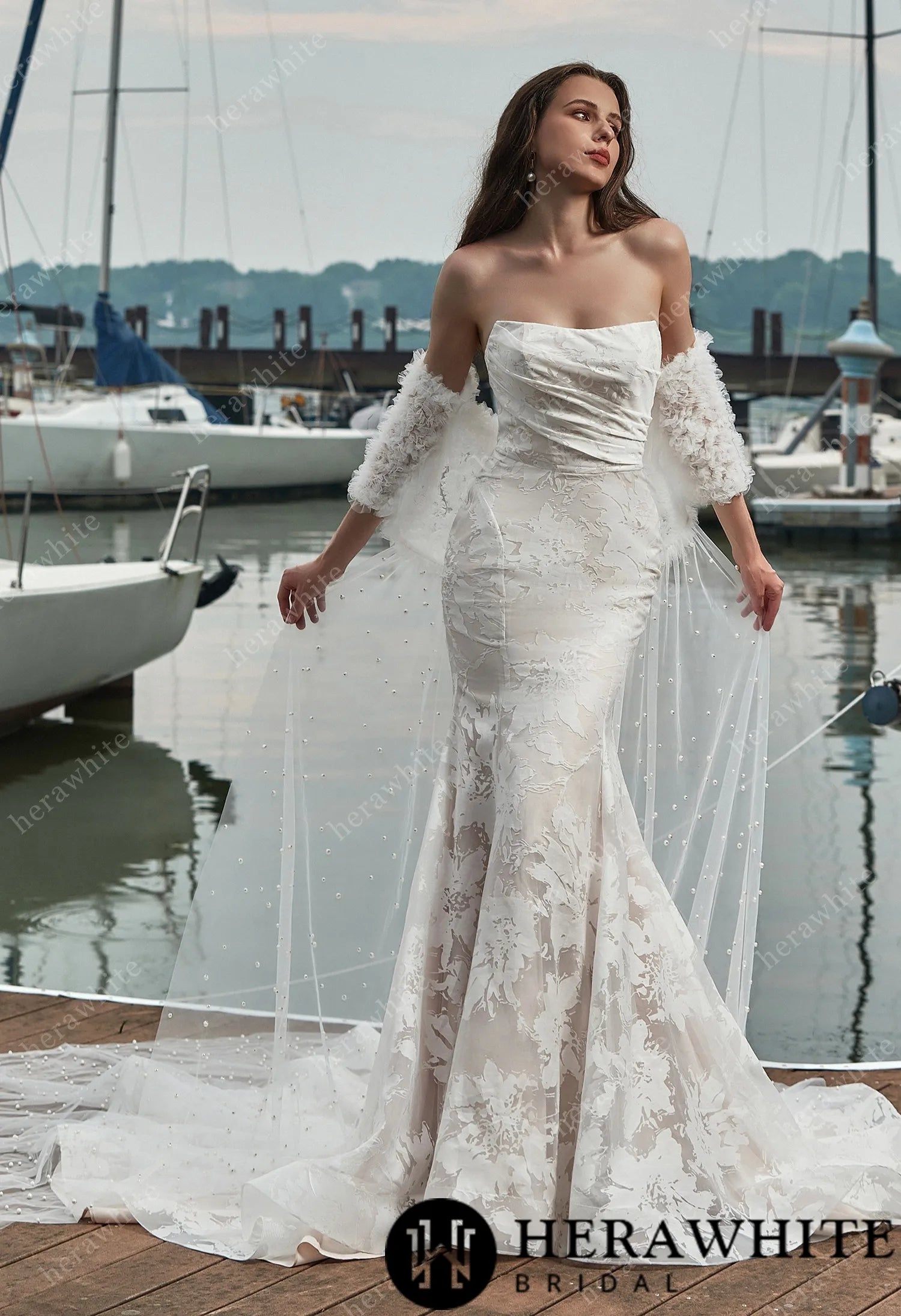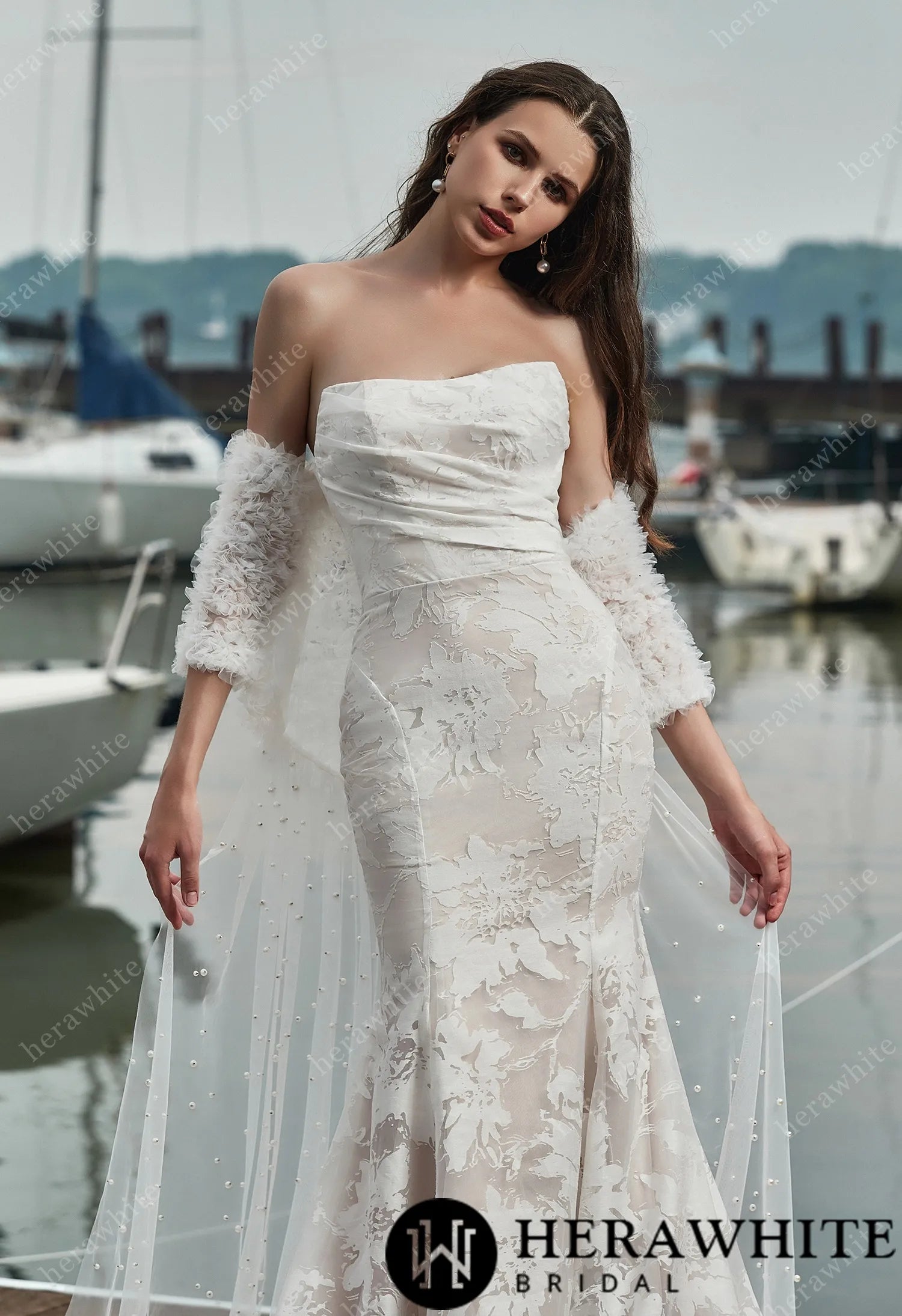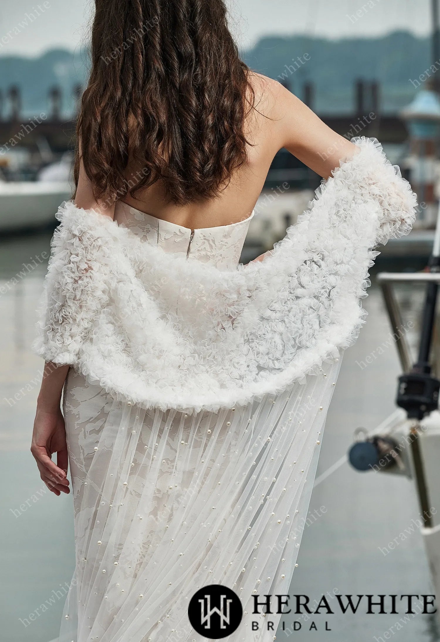 Strapless Mermaid Organza Wedding Dress with Detachable Shawl. This beautiful design blends bold sensuality with old-world romance for a timeless feel. The natural bandeau neckline and detachable shawl design add a touch of classic femininity to the bodice, while the pleated and linear organza at the bust accentuate the corset -style look. The linear nature of these graphic lace designs cuts towards the waist and across the body, shaping the figure and highlighting the negative space of the dress and back. The elegant train flares gently below the hips, further enhancing the fitted silhouette .