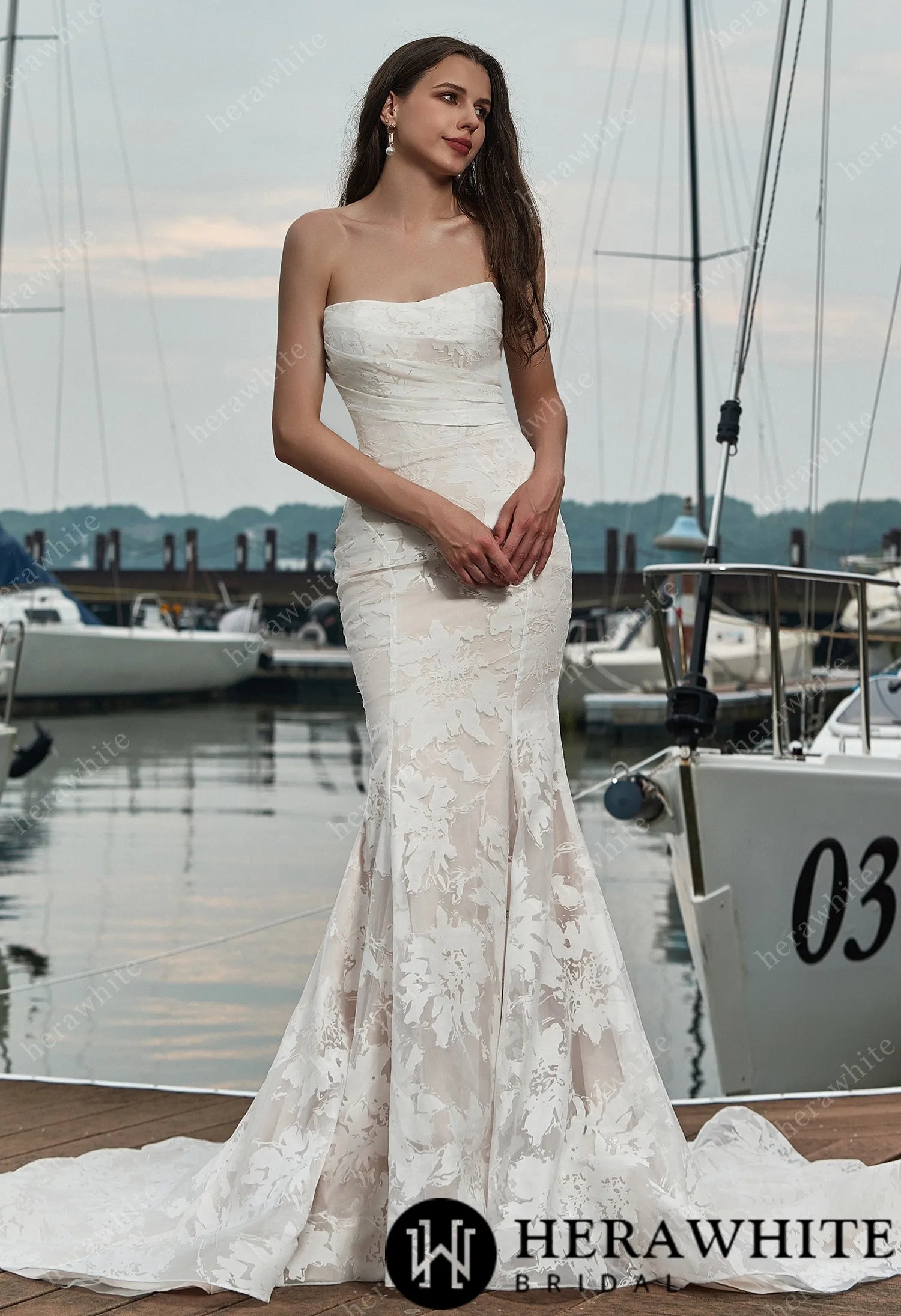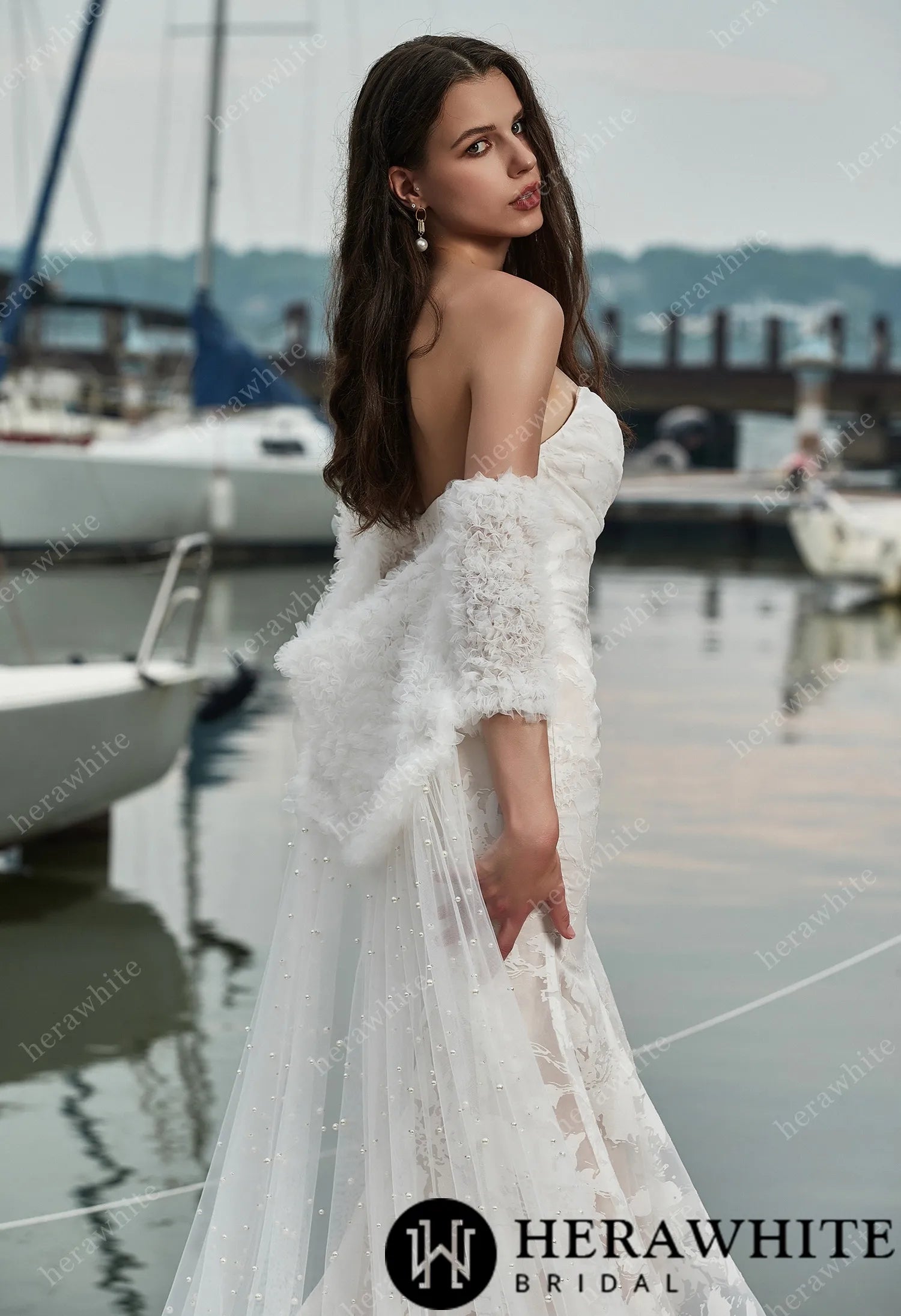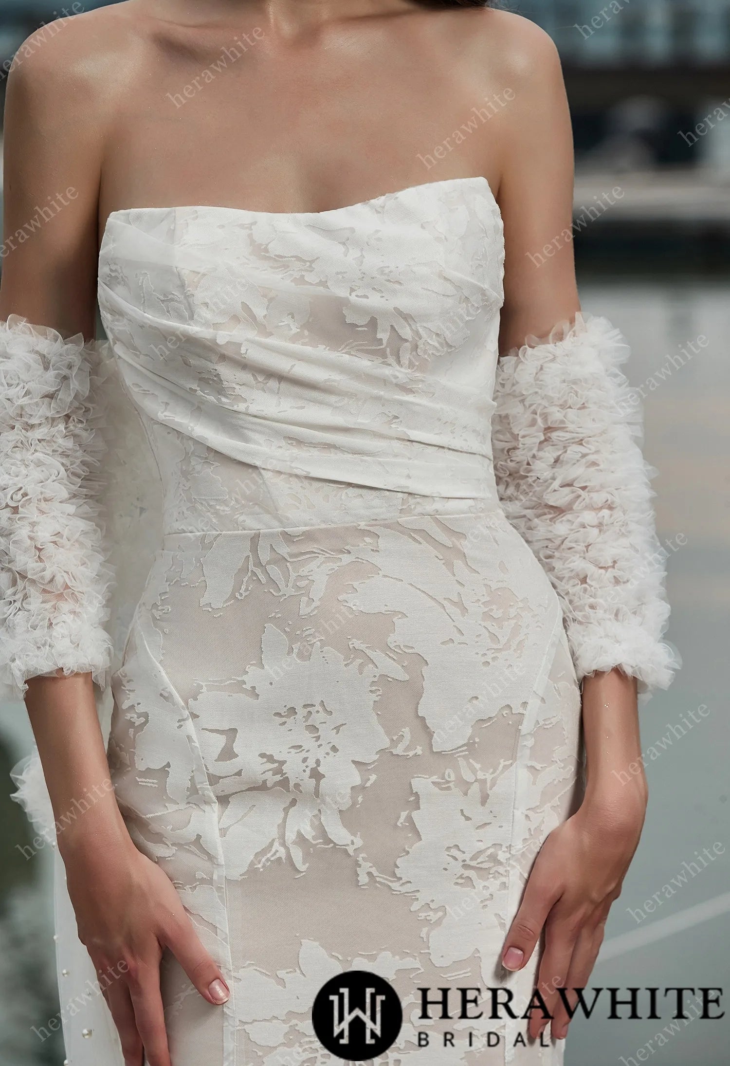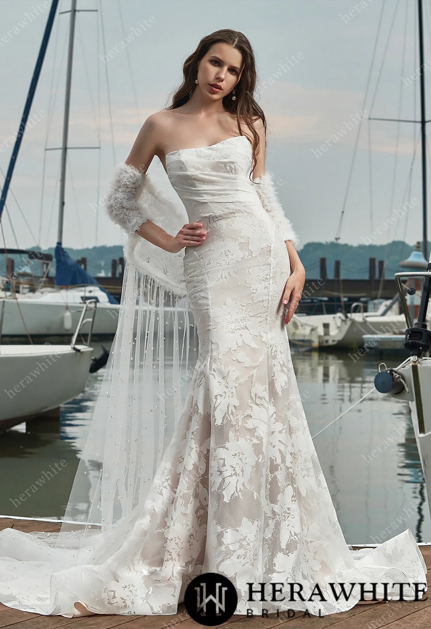 Strapless Mermaid Organza Wedding Dress with Detachable Shawl. This beautiful design blends bold sensuality with old-world romance for a timeless feel. The natural bandeau neckline and detachable shawl design add a touch of classic femininity to the bodice, while the pleated and linear organza at the bust accentuate the corset -style look. The linear nature of these graphic lace designs cuts towards the waist and across the body, shaping the figure and highlighting the negative space of the dress and back. The elegant train flares gently below the hips, further enhancing the fitted silhouette .