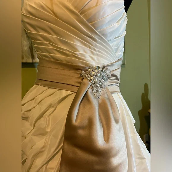 Introducing the epitome of elegance and romance, our Sweetheart and Pleated Bodice Wedding Gown. This enchanting gown captures the essence of timeless beauty, designed to make every bride feel like a true princess on her special day. A satin champagne/palomino bow gracefully adorns the waist, acting as the centerpiece of the gown's charm. The bow not only adds a touch of regality but also serves as a symbol of celebration, symbolizing the joy and unity of the wedding day. Sparkling rhinestone appliques are thoughtfully attached to the bow, glistening with every movement and adding a hint of opulence to the ensemble.