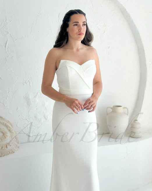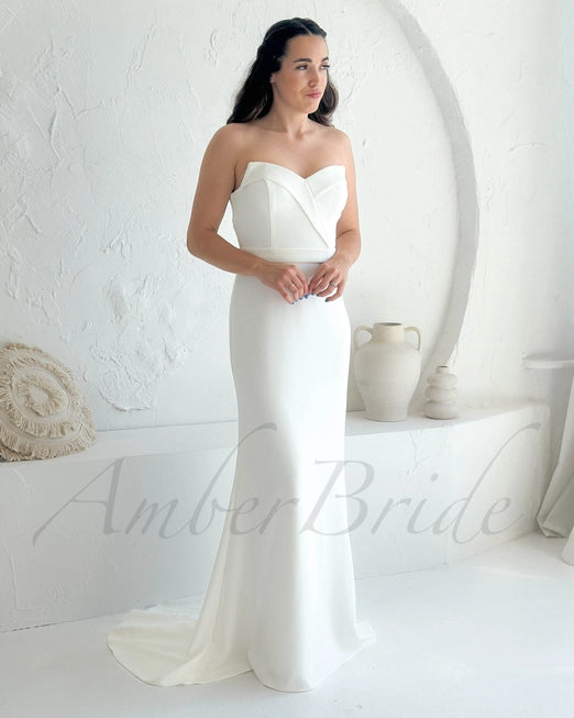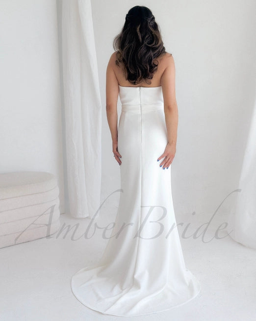 This stunning wedding dress is the epitome of simple elegance. Made with high-quality crepe satin, this mermaid-style dress is sure to turn heads. The sleek silhouette of the dress hugs the curves in all the right places, creating a beautiful and flattering fit. The crepe satin fabric gives the dress a luxurious and smooth feel, making it comfortable to wear all day and night. This beautiful dress is perfect for any bride looking for a simple yet elegant wedding dress that will make her feel confident and beautiful on her special day.
