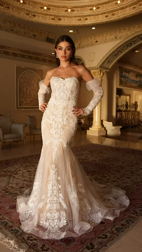 Marlowe is an exquisite mermaid gown in lace with an elegant, strapless neckline. The nude lining pops the Alencon lace through for a rich defined detail. Cut to match, removable three-quarter sleeves are made for movement and decadent accessories. Designed By Cinderella Divine